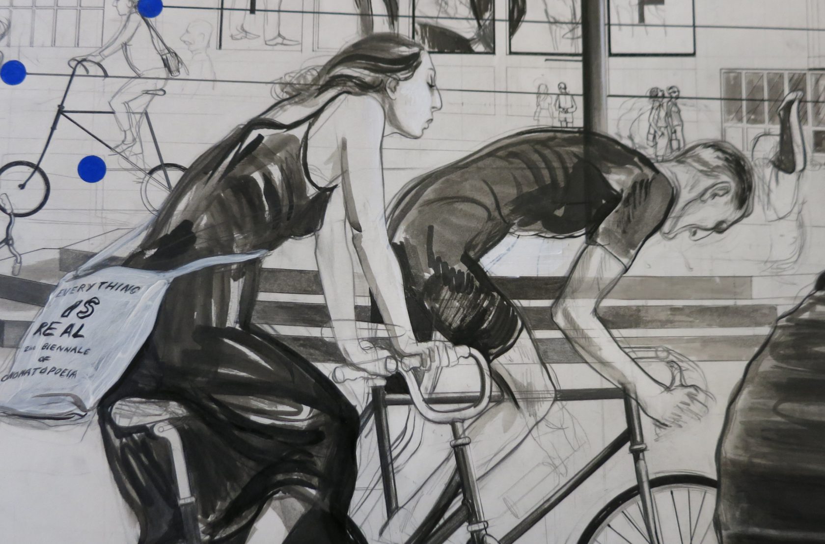 Met al deze invloeden laten de tekeningen zich bekijken als een licht surrealistische film. Een meisje met roze haar probeert haar twee zeurende kinderen te negeren. Haar voet rust op een roze ballon. Hondachtige wezens zoeken naar eten. Een man in een gymoutfit noteert wat in een kladblokje. Hij is in overleg met een man die iets wegheeft van een fascist. Op de achtergrond is een man met een krakeling op zijn hoofd in een soort trance. Enzovoort.