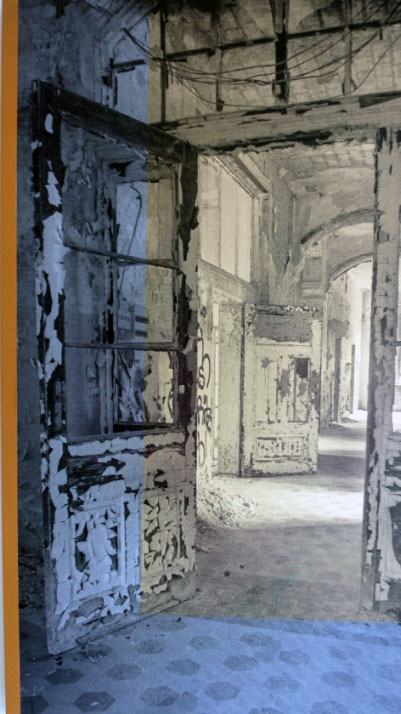 Theo Eissens kreeg van Dijkstra de tip om eens te gaan kijken in een oude kliniek nabij Potsdam, Beelitz Heilstätten. Een krakkemikkig en bouwvallig gebouw. Beetje oppassen dus. Maar het fotografiehart nam het over van het verstand, Eissens schoot er het ene na het andere prachtplaatje, die hij vervolgens zeefdrukkend en schilderend bewerkte tot een kleurrijke serie getiteld Berlin Calling.