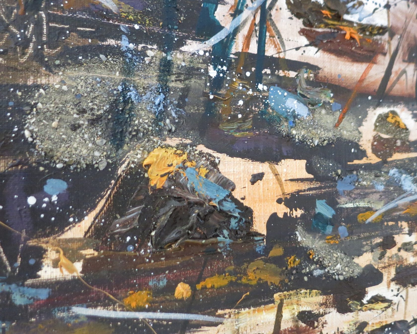 Er blijft zelfs wat ‘residu’ achter op de doeken, zoals zand, stukjes hout en likjes lakverf. Ik ga zelfs twijfelen aan een vlieg die ik op een van de werken zie zitten, maar die neemt toch ineens de benen (vleugels).