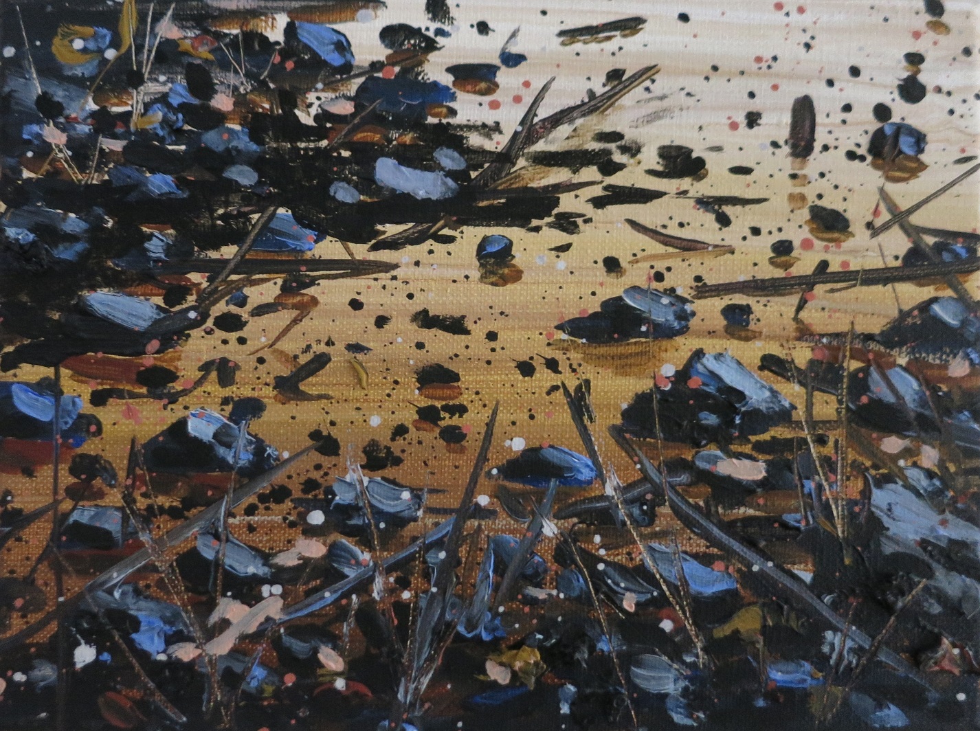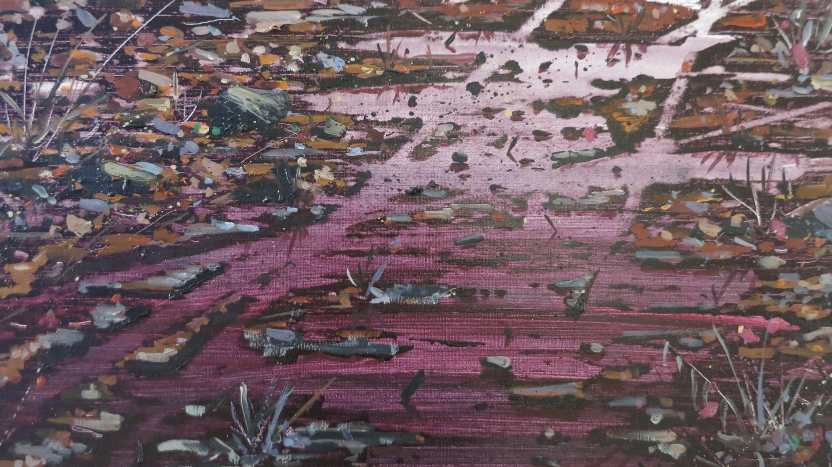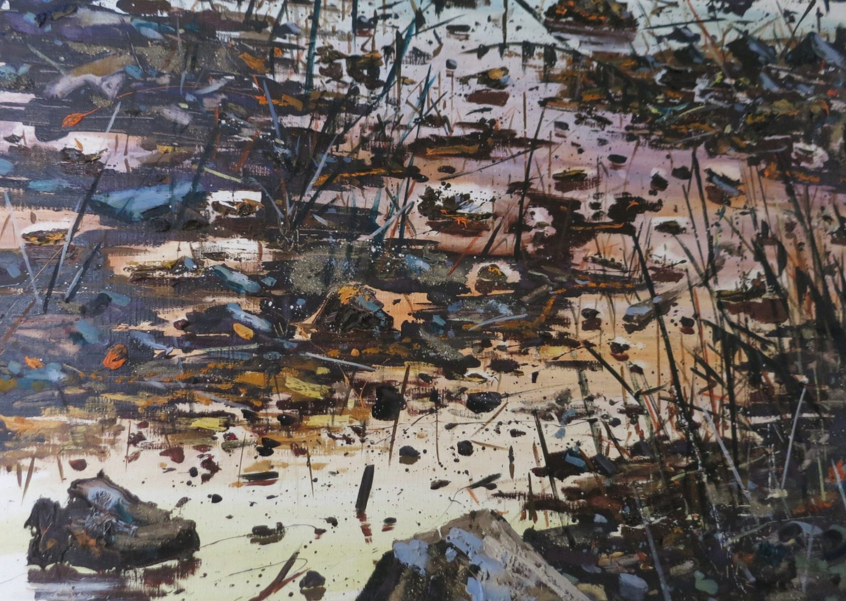 Het eigenaardige is dat de objecten op het doek langzaamaan hun betekenis verliezen. Riet, steen, hout, rots, struiken, golfjes in het water; ze veranderen waar je bijstaat. Iets wat je eerst voor een blad hield, is een paar seconden later een stuk steen.