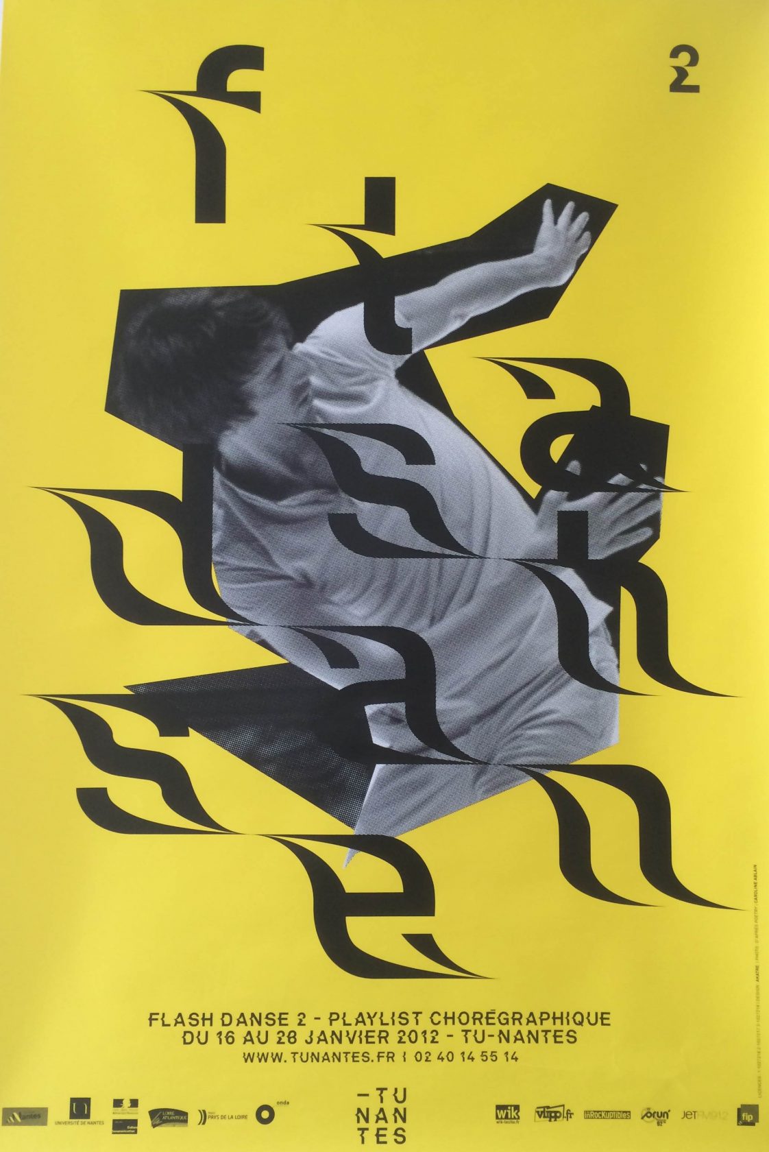 Nog letterlijker is deze mooie poster van Akatre, een ontwerpstudio uit Parijs. Deze poster voor Flash danse doet denken aan een poster voor een karatefilm uit de jaren tachtig. Het gewaagde gebruik van dit lettertype maakt de poster. Geen wonder, ze maken ook lettertypes. Maar ook video’s, installaties en foto’s.