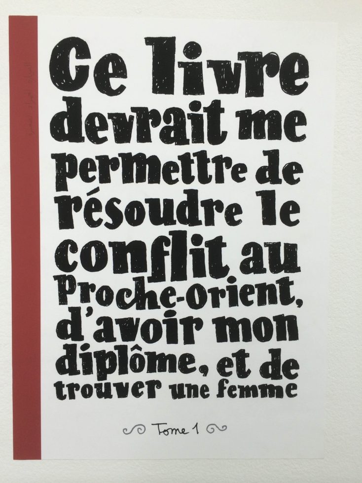 Een mooie aanvulling is het in Gemak tentoongestelde boekje Ce livre devrait me permettre de résoudre le conflit au Proche-Orient, d’avoir mon diplôme et de trouver une femme (Dit boek moet mij helpen om het conflict in het Midden-Oosten op te lossen, mijn diploma te behalen en een vrouw te vinden).