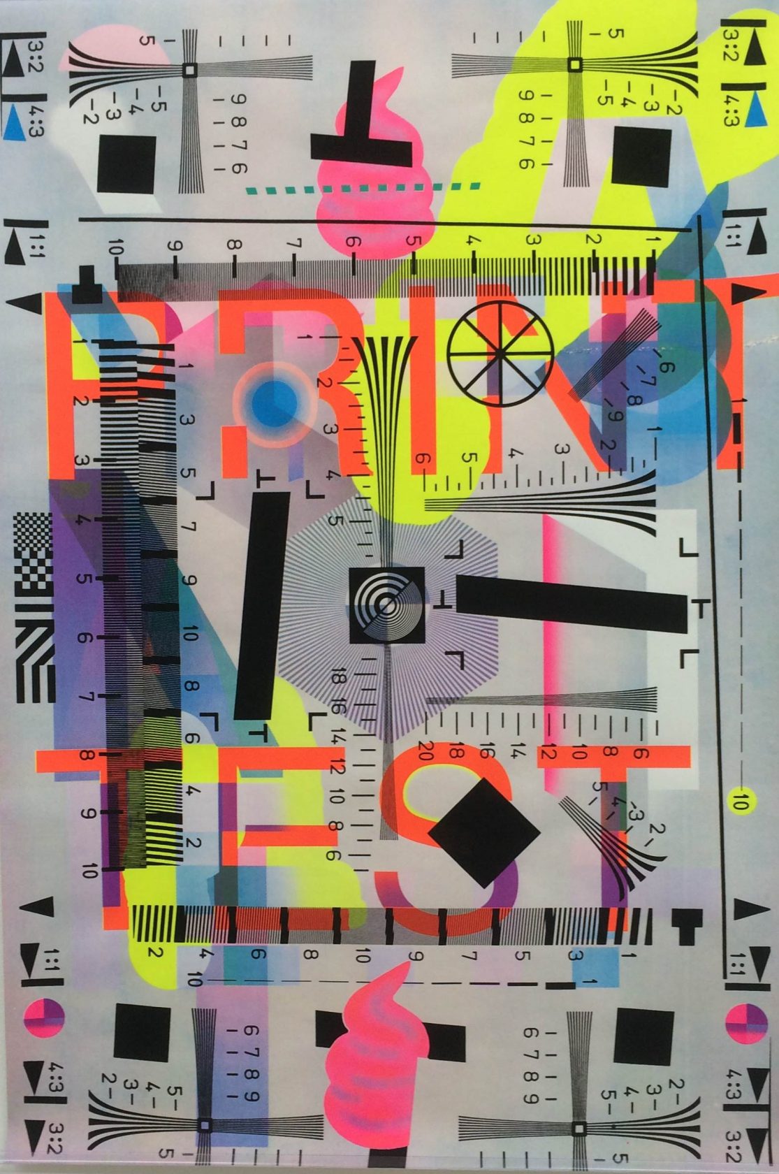 Ook bij Vivien le Jeune Durhin zit er wel wat jaren tachtig in de poster. De felle kleuren (geel, roze, turquoise), de onlogische blokjes en streepjes her en der, de retro aandoende tekst Print Test. Maar zoveel details! Deze poster zit duidelijk in het schemergebied van kunst en poster.