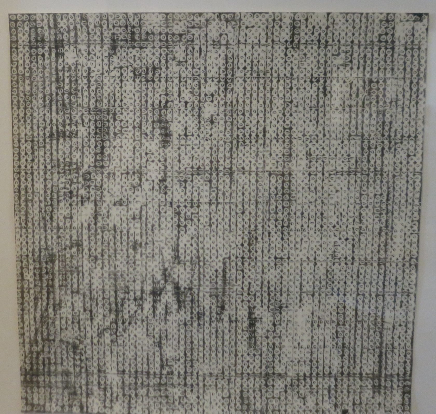 Een andere tekening lijkt op een print van dna-gegevens (of een eerbetoon aan streepjescodes). Het is alsof de opdracht was om een wiskundesom te vertalen naar een kunstwerk.