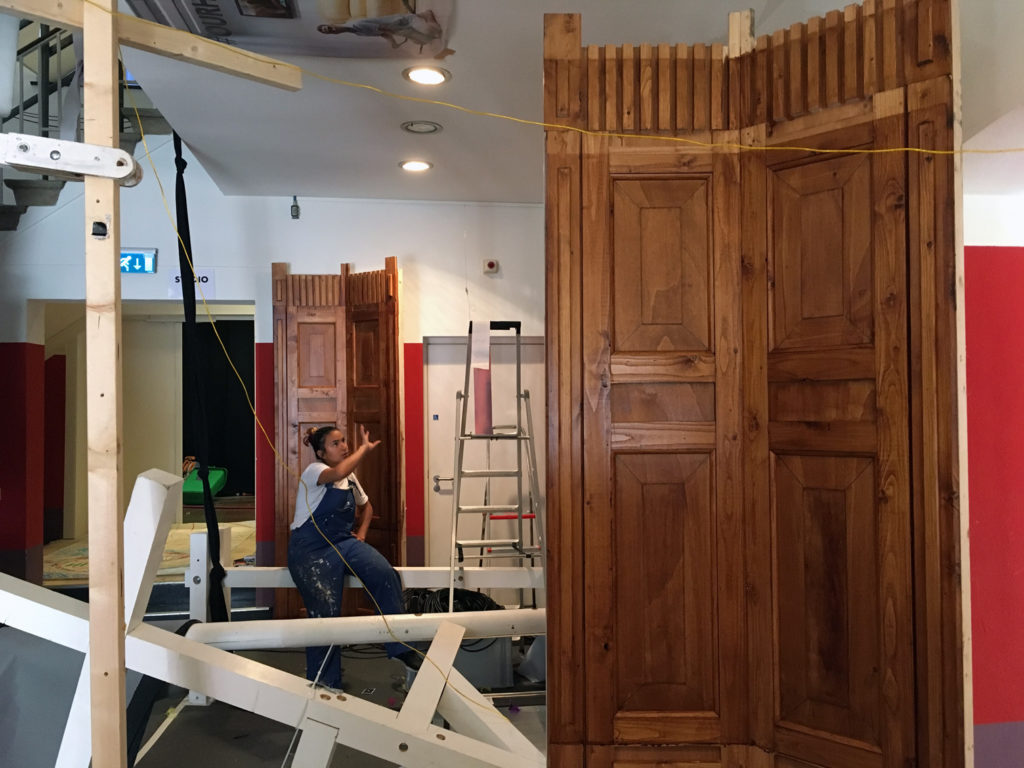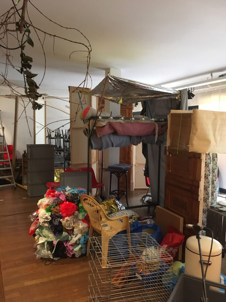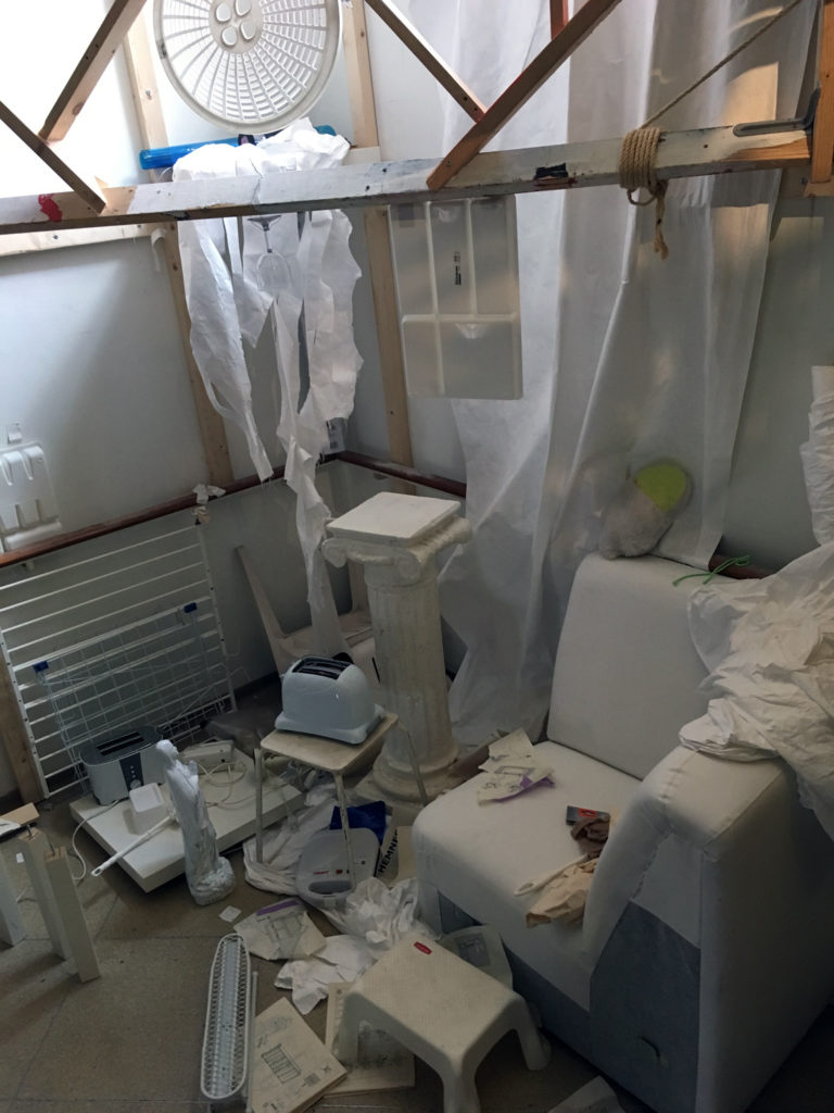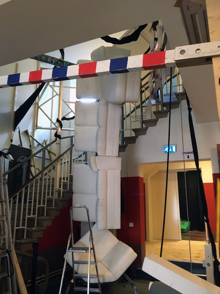 Tot voor kort was ik, misschien een beetje naïef, in de veronderstelling dat mime een theatervorm was die gepaard ging met een aangename stilte. Daar bleek al snel geen sprake van te zijn in het gedeelte waar zich mijn werkplek bevindt, het epicentrum van de zogenaamde Grey Zone. Dit overgangsgebied geeft ruimte aan de chaos en die ruimte is vrij grenzeloos ingenomen. Timmeren, boren, zagen, spullen verplaatsen, en nog meer spullen verplaatsen. Al klussend bewegen de mimers zich voort door het gebouw samen met enkele theatertechnici om te voorkomen dat de boel niet instort. En om de chaos compleet te maken, bouwt midden in dit gebied David Bade een monument voor het vreemde. Een grote totem van witte bankstellen waar aan de onderkant felgekleurde figuren van huisraad zich naar buiten persen, baant zich dwars door het trappenhuis een weg naar boven.