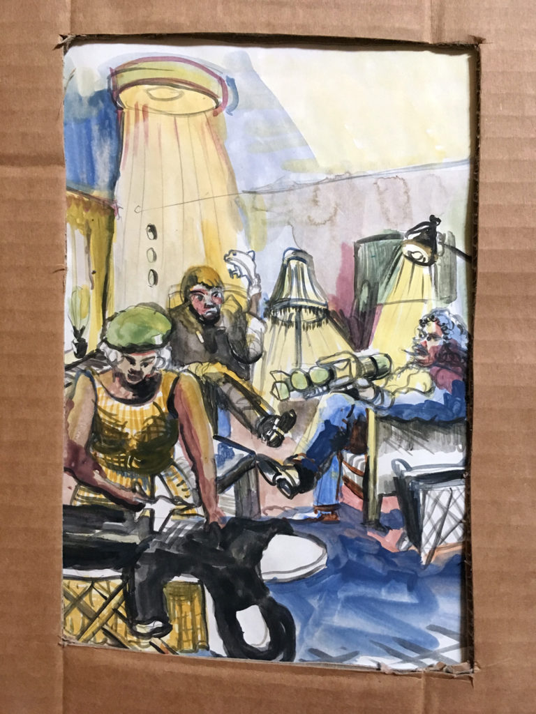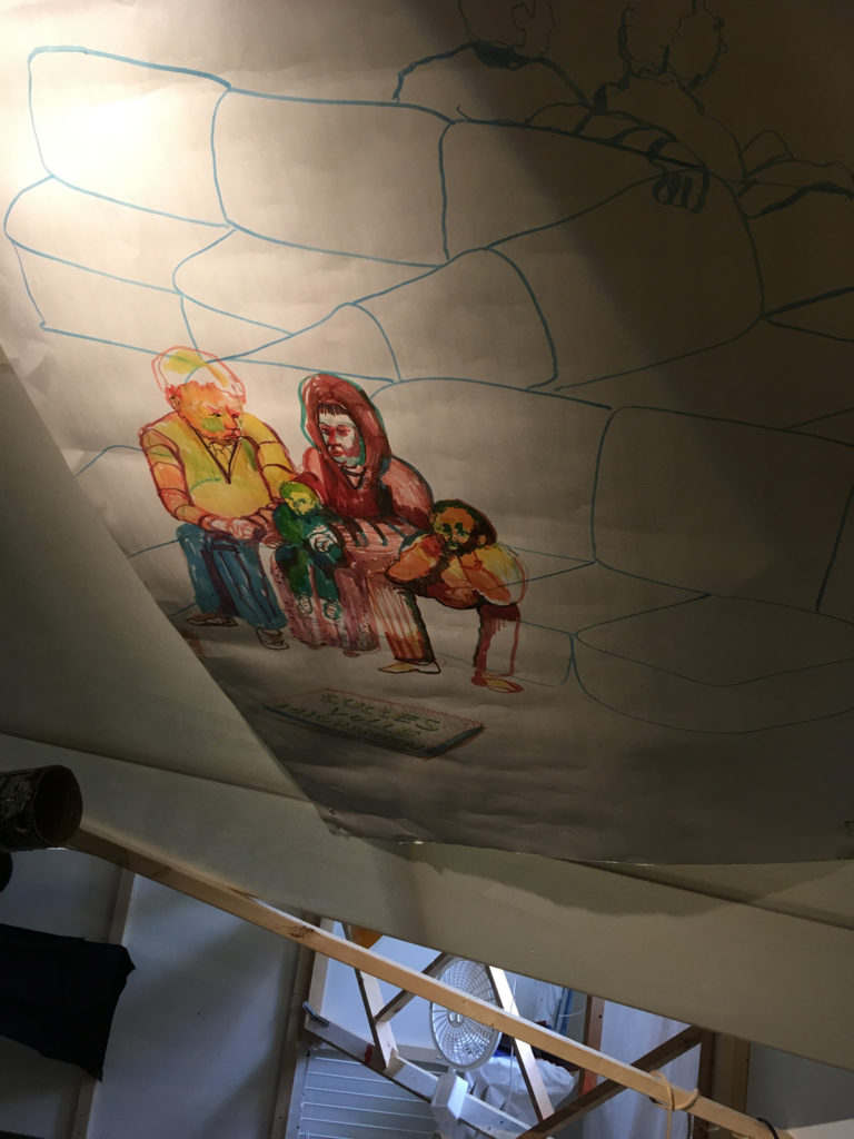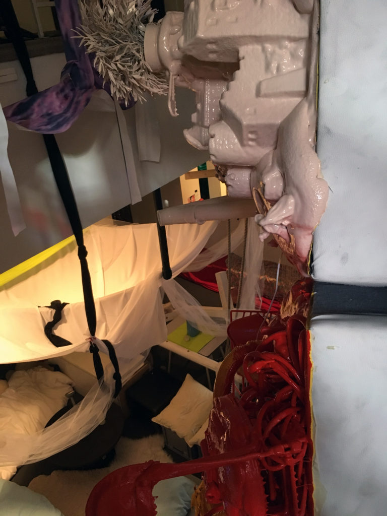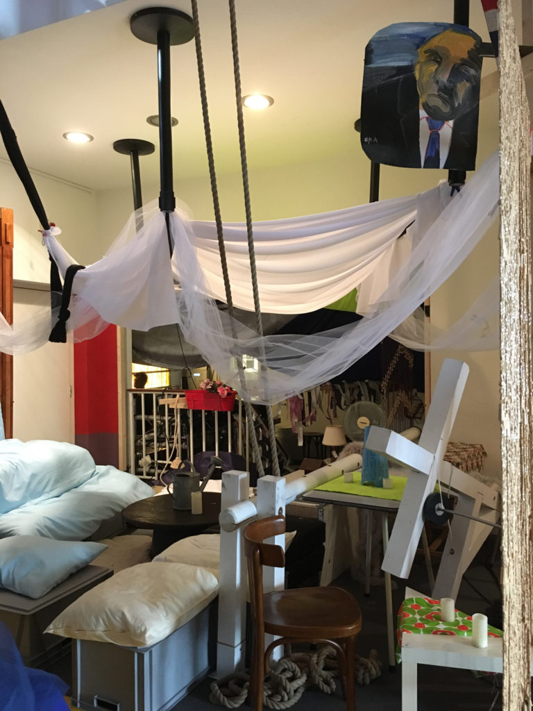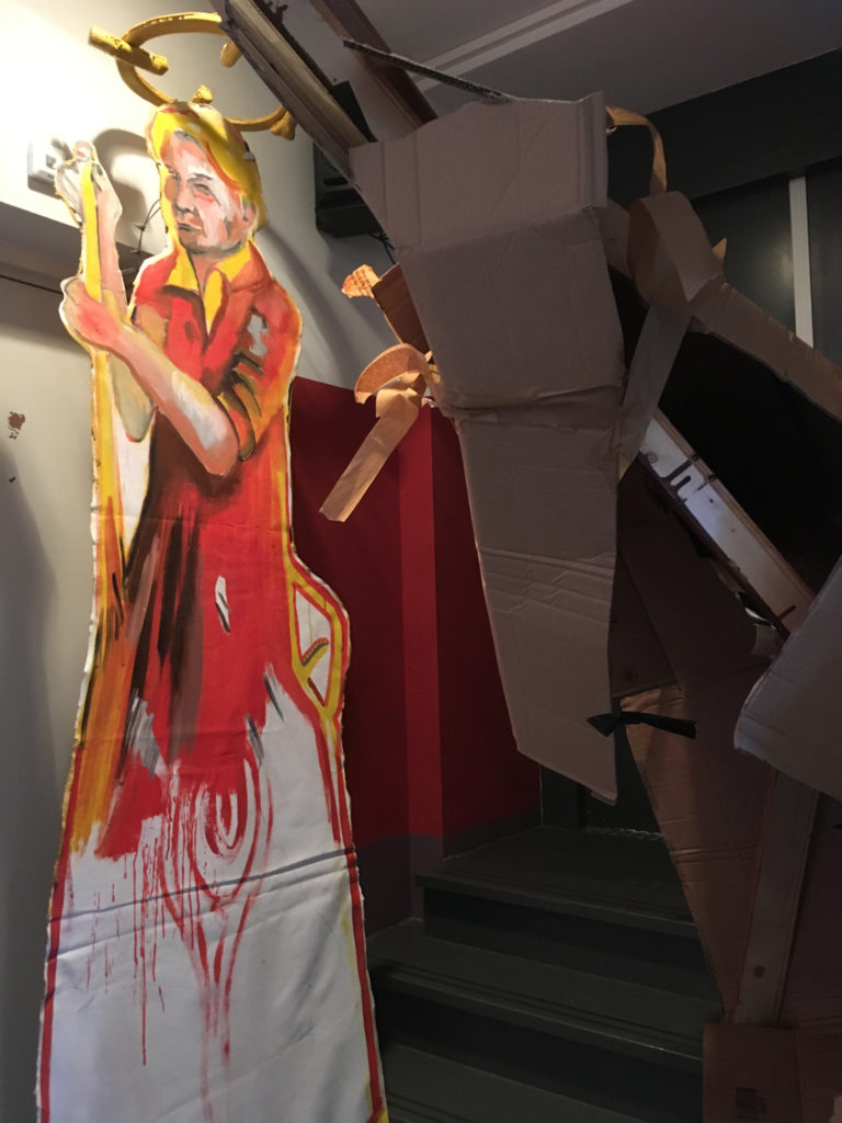 Tot voor kort was ik, misschien een beetje naïef, in de veronderstelling dat mime een theatervorm was die gepaard ging met een aangename stilte. Daar bleek al snel geen sprake van te zijn in het gedeelte waar zich mijn werkplek bevindt, het epicentrum van de zogenaamde Grey Zone. Dit overgangsgebied geeft ruimte aan de chaos en die ruimte is vrij grenzeloos ingenomen. Timmeren, boren, zagen, spullen verplaatsen, en nog meer spullen verplaatsen. Al klussend bewegen de mimers zich voort door het gebouw samen met enkele theatertechnici om te voorkomen dat de boel niet instort. En om de chaos compleet te maken, bouwt midden in dit gebied David Bade een monument voor het vreemde. Een grote totem van witte bankstellen waar aan de onderkant felgekleurde figuren van huisraad zich naar buiten persen, baant zich dwars door het trappenhuis een weg naar boven.