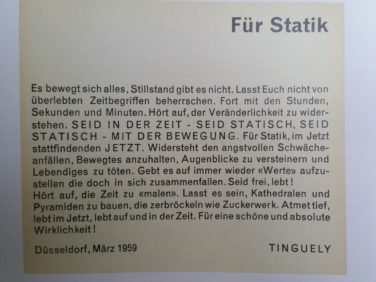 Zijn eerste mobiles in de jaren 30, de bewegende en zelfvernietigende machines in de jaren 60, de parades, zijn Manifest für Statik dat in honderden oplages door de lucht van Düsseldorf zweefde en, niet in de laatste plaats, de tentoonstelling Dylaby (1962) in het Stedelijk Museum Amsterdam waar toenmalig directeur Willem Sandberg Daniel Spoerri en Jean Tinguely carte blanche gaf om de boel volledig op zijn kop te zetten.