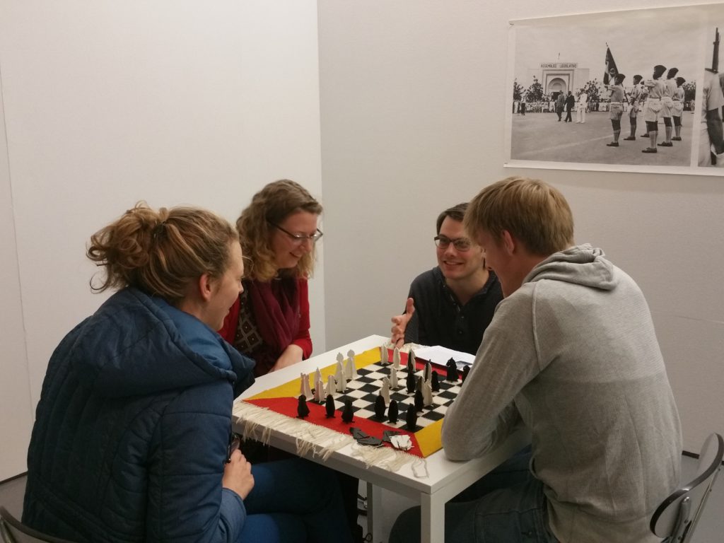 Niet alleen vormt dit werk een hoogtepunt van de tentoonstelling door mijn liefde voor het spel maar ook door de politieke kwesties die dit spel blootlegt. L’Échiqueté is geïnspireerd op de dekolonisatie van 17 Afrikaanse landen in 1960. Niger (nu Burkina Faso) en Benin werden in 1960-61 zelfstandig en bereikten een akkoord met hun kolonisator Frankrijk waarin stond dat Frankrijk hulpmiddelen en -troepen zou sturen naar de twee landen om een nationaal leger te vormen, en in ruil hiervoor kreeg Frankrijk toegang tot strategische punten, olie, gas en uranium. Een driehoeksrelatie van handel en veiligheid was beklonken.