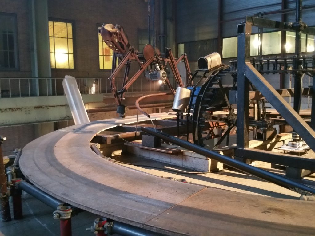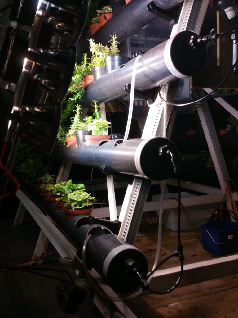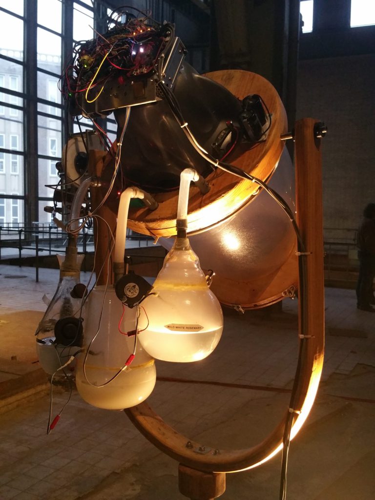 Op de eerste verdieping heeft Christiaan een nieuwe agdal gemaakt, een mechanische tuin voor alle zintuigen. Je ruikt Rozemarijn, je voelt het water, je ziet het ingewikkelde irrigatiesysteem dat allerlei kruiden van licht en water voorziet. Vreemde apparaten sproeien gecontroleerd allerlei geuren door de steeds donker wordende elektriciteitsfabriek. Je hoort getik. Is het geknars van steentjes? Getik van regendruppels?