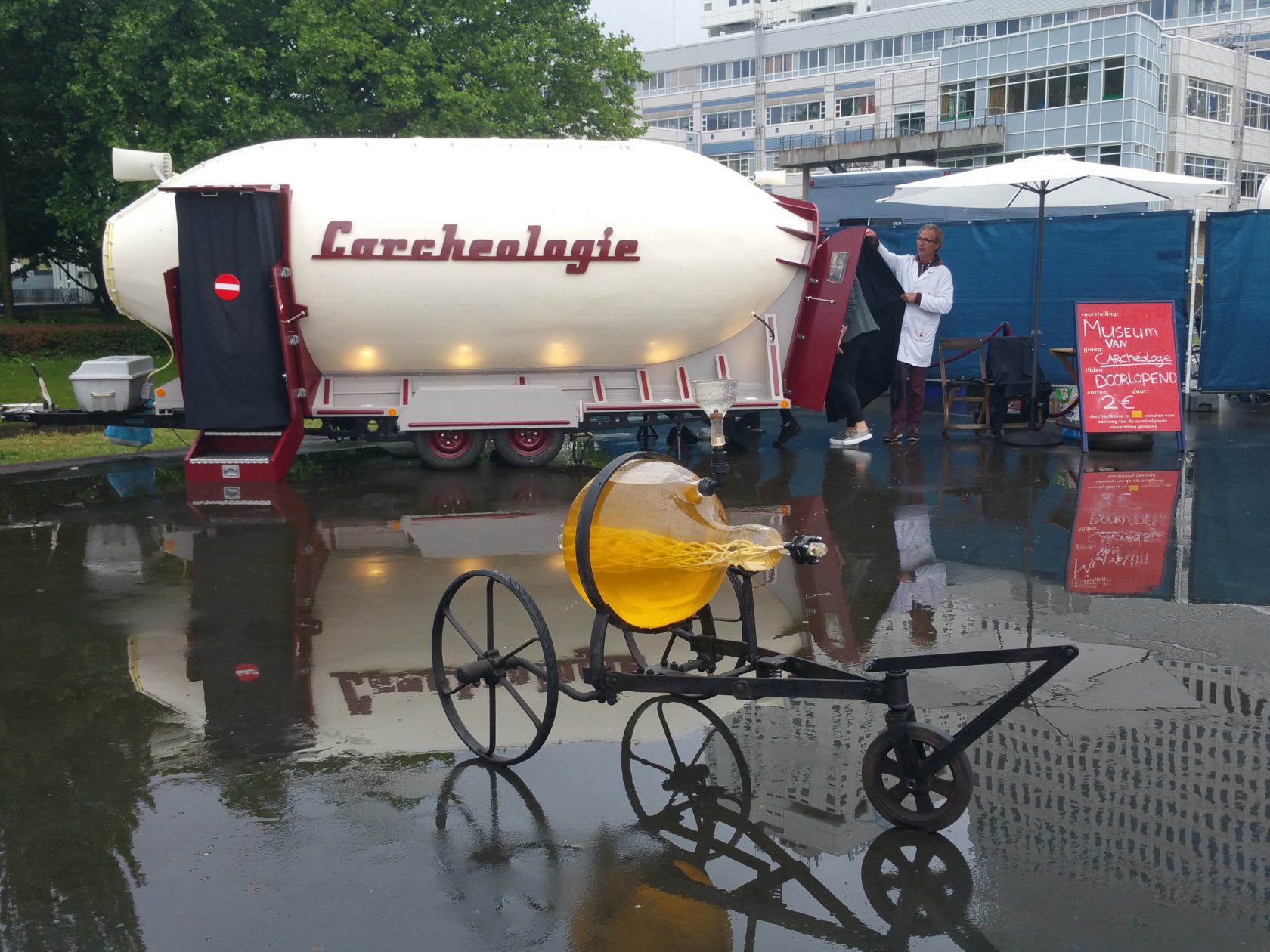De avond begon rustig. Al van kinds af aan ben ik doller op auto’s dan op poppen dus mijn eerste stop was bij het museum van carcheologie van Olaf Mooij, een rariteitenkabinet waar de levenscyclus van de auto centraal staat. Voor 2 euro beland je in een typische ‘Paradewereld’ waarin je jezelf na 10 minuten afvraagt of een auto via kunstmatige inseminatie tot leven gewekt kan worden en waar de mitose (mitose is overigens kerndeling, nu ik bioloog ben zie ik alles anders) in de kern van een auto ontstaat.