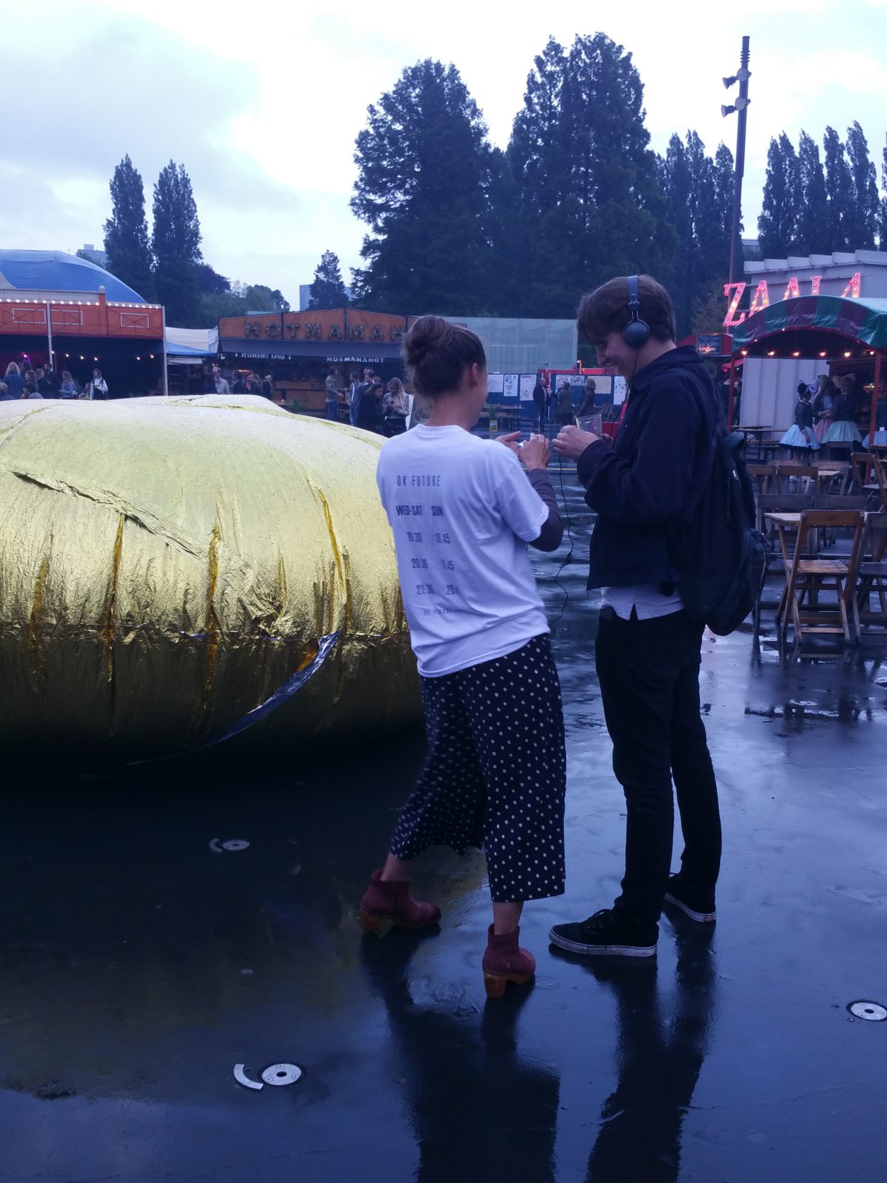 Midden op het terrein kwam ineens een gouden donut (zonder gat) voorbij en zelfs voor de doorgewinterde Paradebezoeker was dit ‘out of the ordinary’. Er omheen liepen medewerkers die je met koptelefoons een voorproefje van de voorstelling OK Future van Connor Schumacher en Lucy Suggate gaven. Kijkend naar de gouden donut luisterde ik naar de vrouwelijke stem van een mindfullness cyborg die mij vroeg wat ik zag en of ik een patroon herkende.