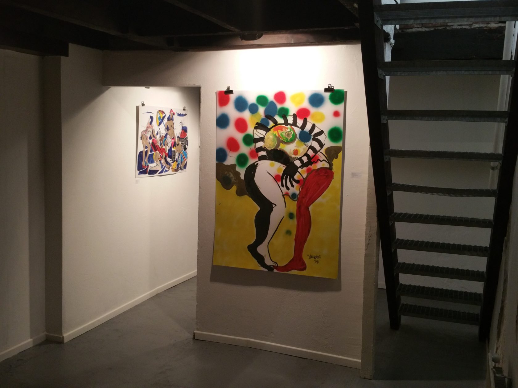 De Haagse klant is wat conservatiever, vanmorgen had ik een mail uit Israel van een grote verzamelaar die reageert op dit werk maar uit Den Haag weinig. Mensen komen binnen en zien de vrolijke kleuren en bewegingen, en dan komen ze binnen en denken… ooooh.. dan zien ze de serieuze thema’s en mensen schrikken daar ook van. Wij hebben ook tegenslagen gehad met het organiseren van de tentoonstelling. Hij zou eigenlijk hier naar Den Haag komen om te werken voor een paar weken, hij had ook een residentie in Italië, maar wij kregen zijn visum (hij komt uit Zimbabwe) niet rond. Dus dat was een enorme teleurstelling. Mede hierdoor was het ook moeilijk om de werken hier te krijgen. De praktijk wijst dan uit dat de aanloopperiode zo veel hobbels heeft dat de daadwerkelijke tentoonstelling iets langer duurt.