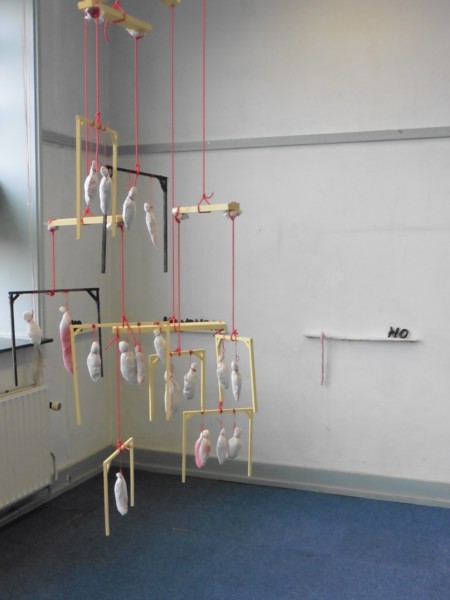 In het trappenhuis en in de klaslokalen op de eerste verdieping is in de serie “The Kitchen” een tentoonstelling ingericht met werk onder de naam Howling Dog. Er is werk te zien van Sid Young (Debby Young en Katarina Sidorova), Harriet Morley en Alex Birch. Aangezien een krantje met de naam Howling Dog bij de tentoonstelling kon worden mee genomen dacht ik dat het over een collectief onder die naam ging en ik weet het nog steeds niet zeker eerlijk gezegd.