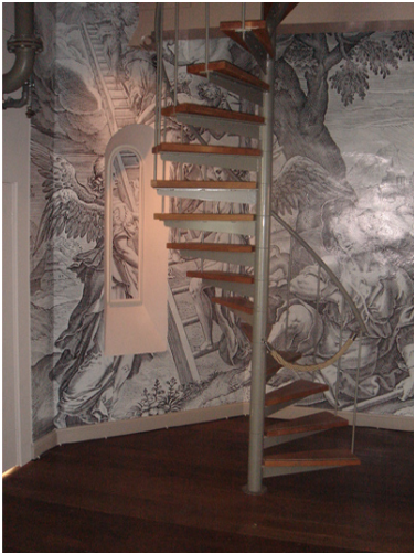 ‘To create 3D from 2D and vice versa, that’s an example of such a layer. Take the position of the Jacob’s ladder next to a real staircase, like in ‘All kinds of Angels’. Or at ‘Prints in Paris’, with prints of paneling, stickers of wooden floors and a rug with a shadow. I put a lot of effort into them.
