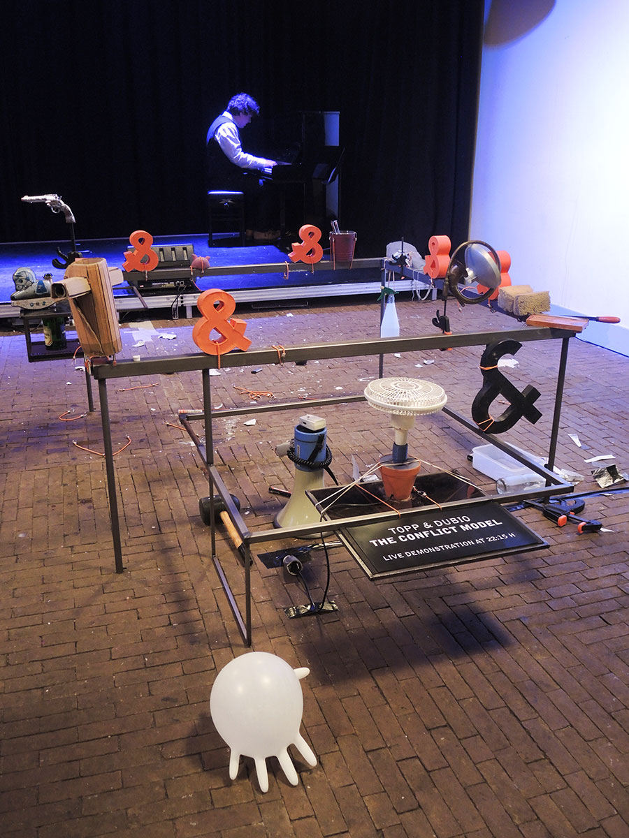 Na het debat besluit ik nog wat na te dromen bij Ruimtevaart, dat ook een locatie is voor het GROUND Festival. Er is onder andere een Marrokaans filmprogramma te zien onder de titel Marrakech Digital. Ik val gelukkig precies in het deel waarin vooral abstracte films worden vertoond en neem plaats in de filmzaal. Ik zie langzaam evoluerende beelden met gasbelletjes, streepjes en af en toe… een kloddertje roze. Hier en daar. Maar misschien is dat aan de binnenkant van mijn ogen. Ik realiseer me dat dit slechts een vlucht is uit de werkelijkheid. Maar ik blijf gewoon nog even lekker zitten. Om daarna terug te keren naar het Koorenhuis en weer geheel bij zinnen te komen bij een live demonstratie van de Topp & Dubio installatie: ‘The Conflict Model‘. Eindelijk, ik ben weer thuis. En ik sta met beide benen op de grond. Goddank.