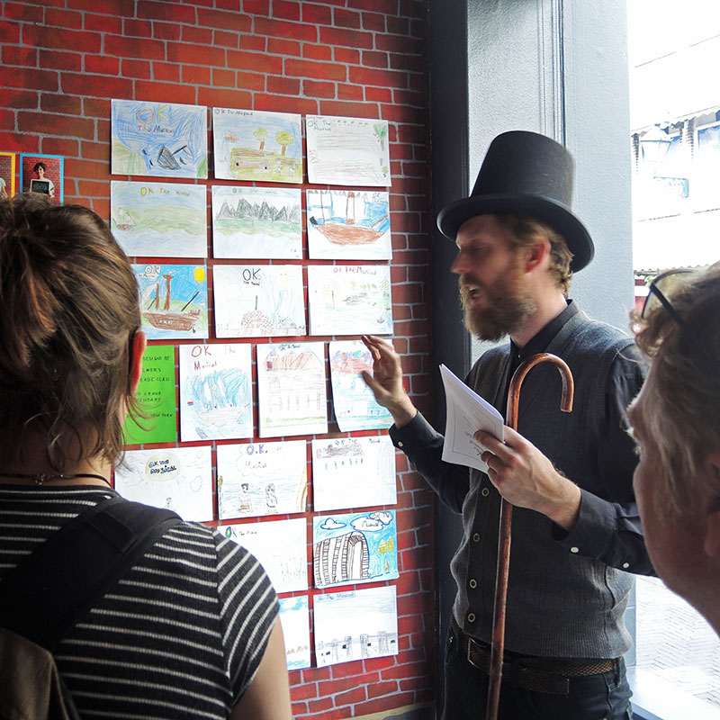 Wanneer we 1646 betreden, belanden we in het jaar 1609. Hier begint O.K. – The Musical (Dutch Colonial). De oorspronkelijke Mohicaanse bewoners van Kline’s geboortedorp Kinderhook (O.K. is Old Kinderhook) komen in aanraking met Nederlandse kolonisten. Het is de eerste van vijf scènes die in Den Haag te zien zijn. Kline leidt ons zelf rond in zijn theatrale wereld van bordkarton en vrolijke wandschilderingen. Het is duidelijk dat we in een Amerikaanse schoolmusical terecht zijn gekomen. Maar alle decors, liedjes en verhalen zijn de afgelopen maand door Haagse vrijwilligers in elkaar geknutseld en ingestudeerd. Het is onderdeel van een ongoing project over geschiedschrijving in het klein en in het groot. In elke presentatiestad schakelt Kline de hulp in van de lokale bevolking om het project verder mee uit te voeren. Als rondleider bagatelliseert Kline zijn eigen rol wanneer hij zegt dat hij niets zelf heeft gemaakt. Dit is een enorm eenmansproject waar hij al vijf jaar mee bezig is en waarin hij alle mogelijke rollen aanneemt. Joop van den Ende is er niets bij.