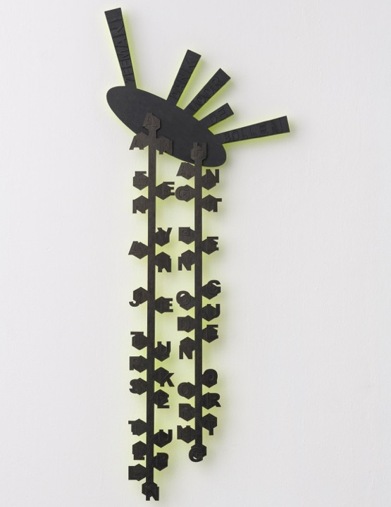 Een loot aan de boom van deze artistieke evolutie is ook Karin van Pinxteren. In twelve-twelve gallery zitten haar woorden de ene keer aan een soort hangplantconstructie vastgeplakt; de andere keer verstopt in een soort dartbord-ganzenbord-roulette-constructie (met haar ‘vertrouwenslampje’ als bull’s eye).