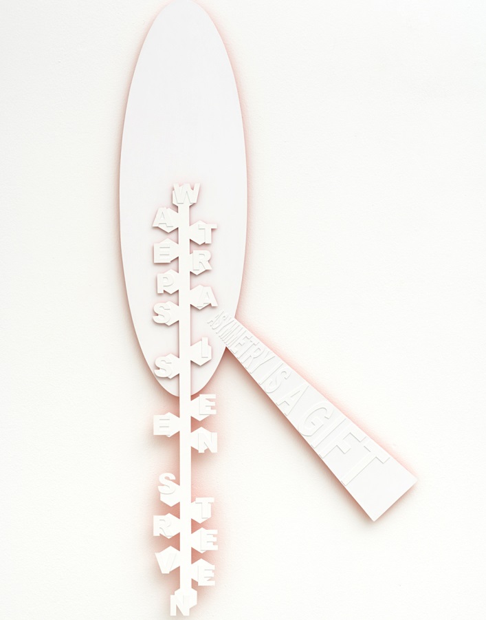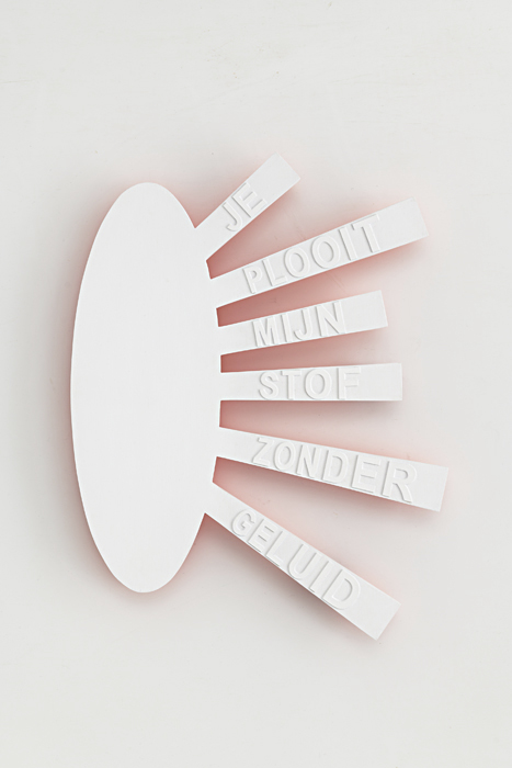De woorden domineren de werken niet, zoals bij bijvoorbeeld Bruce Naumann, maar zijn er eerder per ongeluk ingerold. Ze zijn minder bezig om een statement te maken. Dat geeft een bescheiden karakter aan de kunstwerken.
