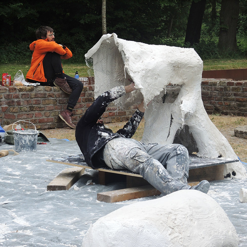 Na een fietstochtje door het onaffe Vroondaal, dat nog het meeste weg heeft van een vooroorlogs filmdecor voor een Nederlandse speelfilm, bereik ik de idyllische open plek in park Madestein waar de kunstenaars de laatste hand leggen aan hun sculpturen. Deze in 1973 uitgegraven archeologische locatie werd vorig jaar door Iliada Charalambous herontdekt. Ze besloot er haar eerste tentoonstellingsproject te realiseren. Dit zijn de fundamenten van de eerste nederzetting van Den Haag.