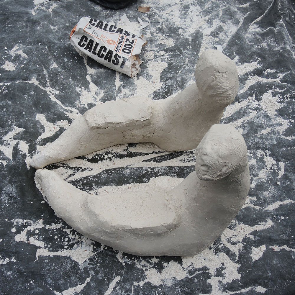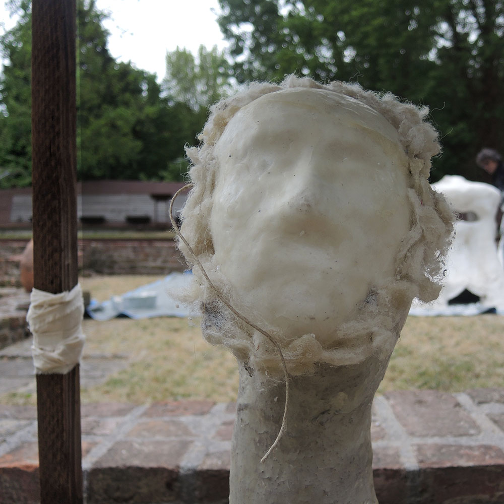 Voor de gelegenheid heeft hij ‘zijn’ kamer tot werkplaats gepromoveerd. Maar morgen tijdens de opening zal hij het werkproces niet tonen. Slechts de resultaten blijven als artefact over. ‘Attempt of Reconstruction’ bestaat uit drie delen: de neus, de kaken en het achterhoofd. De neus en de kaken komen op een kleine verhoging van betonplex, maar het blijven halffabricaten. In plaats van het atelier dat het nu is, zal de kamer morgen als toonzaal functioneren. De vraag naar welke reconstructie de bezoeker dan zal kijken. Is het de poging om uit het geheugen een schedel te maken, het werkproces? Of wordt de reconstructie als museaal object geëxposeerd en doet het er niet meer toe waar en hoe het is gemaakt? En omdat De Stenen Kamer zelf ook al een reconstructie van een oud bouwwerk is, lijkt er sprake van een Droste effect. Over welke reconstructie hebben we het nu eigenlijk? We besluiten met de gedachte dat de geschiedenis altijd in het heden wordt geschreven en ook niet meer kan zijn dan een reconstructie. Met terugwerkende kracht vertelt het iets over hoe we nu naar vroeger kijken. Zoals dat voor dit hele project geldt. Het is dus aan de bezoeker om uit te maken hoe deze sculpturen in deze setting zullen werken.