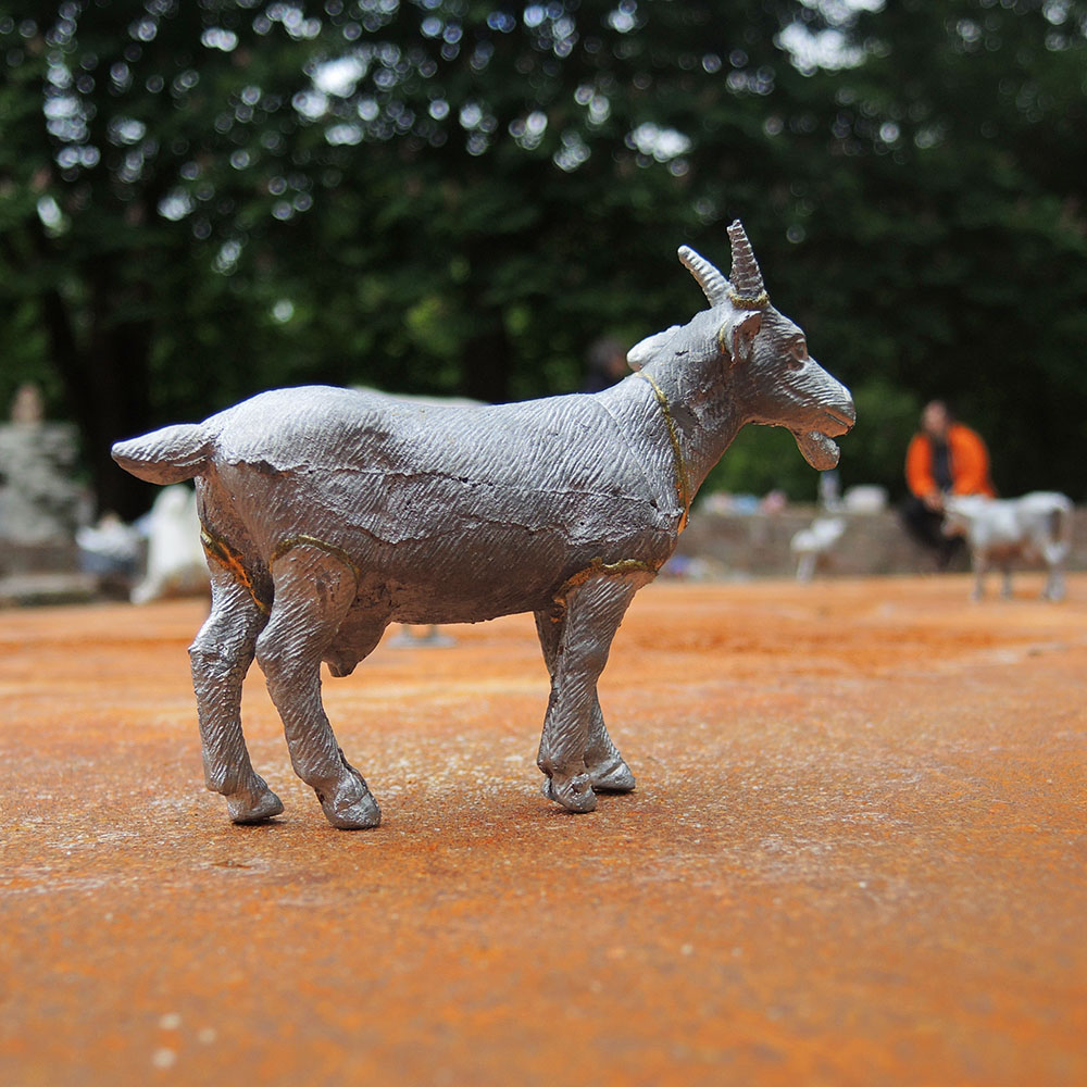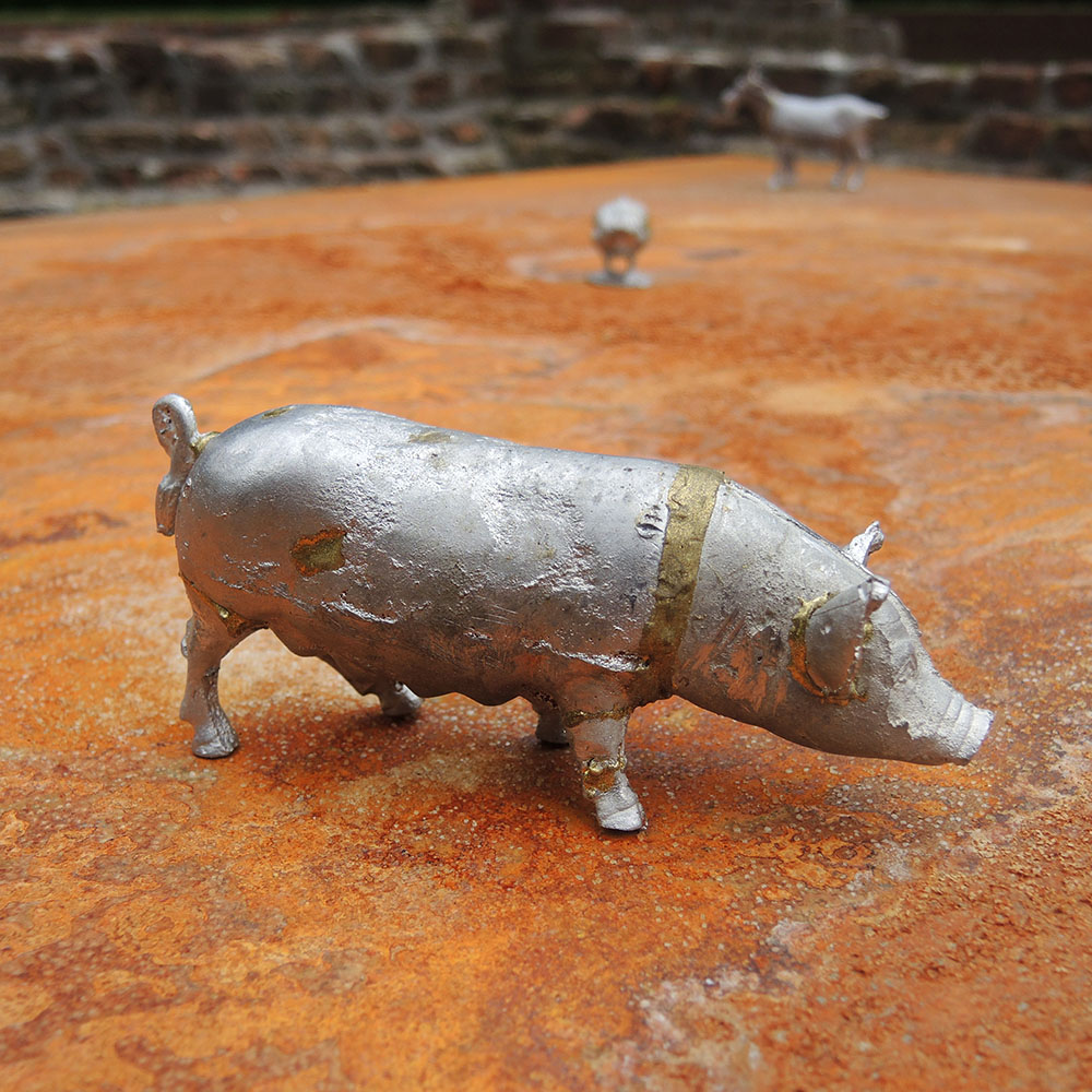 Luis Maly heeft voor dit project misschien het meest kwetsbare werk gemaakt. Op een tafel met een tafelblad van gecorrodeerd cortenstaal heeft hij kleine boerderijdieren van tin geplaatst. Plastic speelgoeddieren werden afgedrukt in zand dat als mal diende voor het gieten van tin. Een ambachtelijk proces naar Japans voorbeeld. De losse onderdelen werden met goudkoper en epoxy aan elkaar gezet. Maar je moet de tinnen werkjes van dichtbij bekijken om dat te zien. “De grootste uitdaging voor dit werk was om de juiste schaal te vinden. De ruimte laat zich heel moeilijk inschatten.” Een maand geleden bracht hij één diertje mee om het ter plekke te bekijken. Normaal maakt Luis grote monumentale constructies en dit is voor het eerst dat hij een werk voor de buitenruimte maakt. Werk dat er in een atelier monumentaal uitziet, kan in een open ruimte heel klein uitvallen. Hij koos de verdiepte kelder als ruimte om zijn tafel in te plaatsen en zocht er naar de juiste verhouding en schaal. Het tafelblad bracht hij op gelijke hoogte met de stenen muurtjes. Hoewel de tentoonstelling slechts twee dagen blijft staan, wilde hij een werk maken dat robuust is en lang mee kan gaan. Nee, hij zou het niet erg vinden als het hier permanent zou blijven staan. Het vakmanschap, de robuuste staalconstructie en het ambachtelijke maakproces zijn voor hem manieren om aan te sluiten op de duurzaamheid van De Stenen Kamer. Voor het tafeloppervlak, dat een landschappelijk karakter moest krijgen, heeft hij het proces van corroderen moeten versnellen. Normaal gesproken creëert hij ook de omgeving van zijn sculpturen door er een ruimte omheen te bouwen. Maar nu moet hij zijn werk aanpassen aan de condities van deze plek. Het werkt heeft zich aan de ruimte aangepast. Het staal van de tafel correspondeert met de bestaande stalen trap die naar de keldervloer afdaalt. En aan een wand is een verhoging dat als bank voor de tafel zou kunnen dienen. Met de compositie van de dieren kan nog worden gespeeld. De tinnen diertjes staan er los op en worden ‘s nachts in een kistje opgeborgen.
