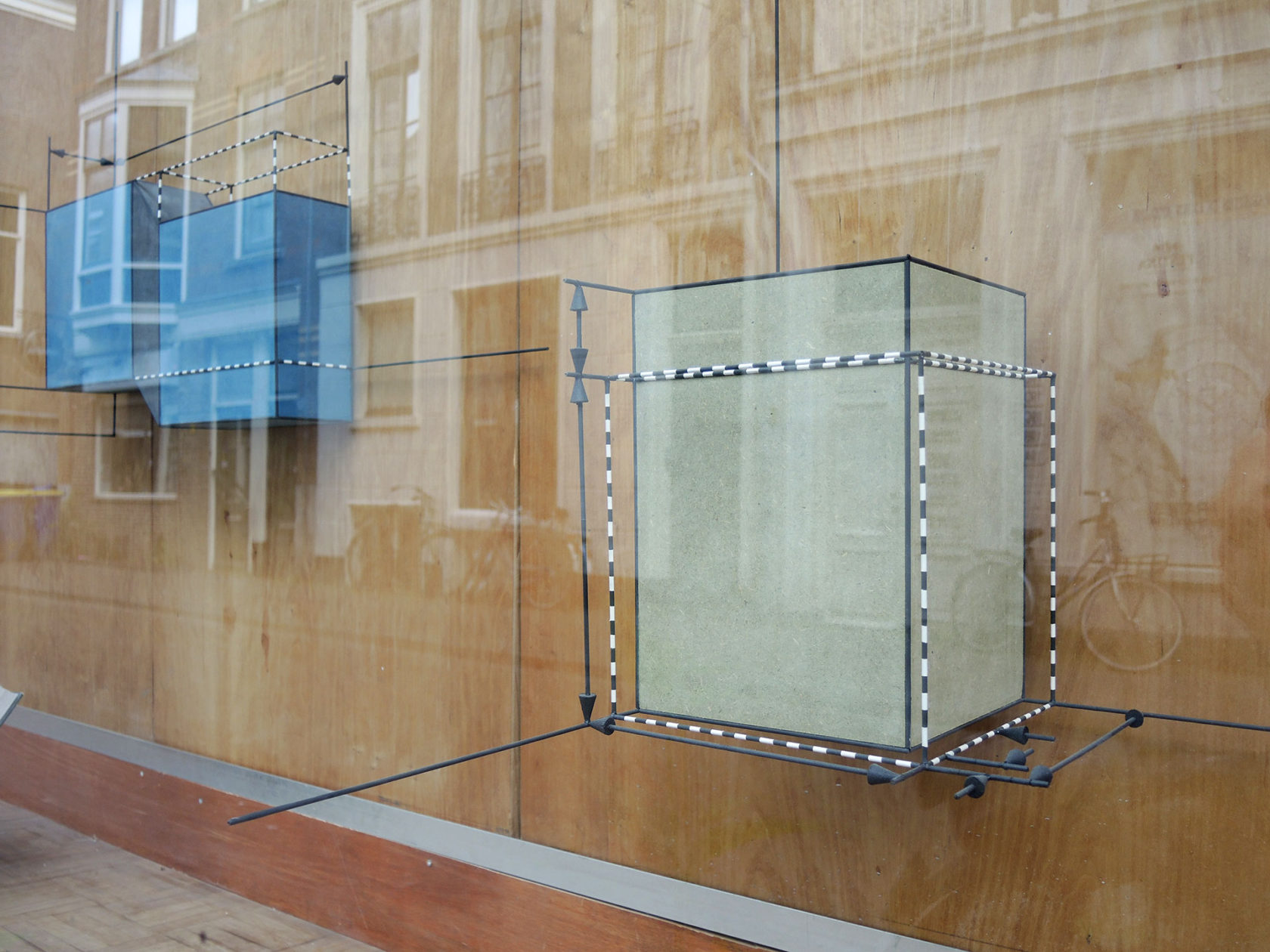 Nu toont Rick van Meel enkele nieuwe, en veel kleinere, werken bij The Balcony, een bescheiden etalageruimte in de Haagse binnenstad. En het werk past er op een wonderlijke manier. Het is opgesloten, maar door de spiegeling van de etalageruit toont het zich ook buiten de etalage en kunnen we de modellen als balkons aan de gevels tegenover The Balcony zien hangen. Ik ga bijna vermoeden dat Rick van Meel, als een kleine Maurizio Cattalan, nog ergens aan een balkonrek hangt te bungelen in de hoop door een passerende held (ik?) te worden gered. Maar hij is nergens te bekennen. Hij moet er vanaf gesprongen zijn. Verdwenen in de ruimte, in een andere dimensie of next level.