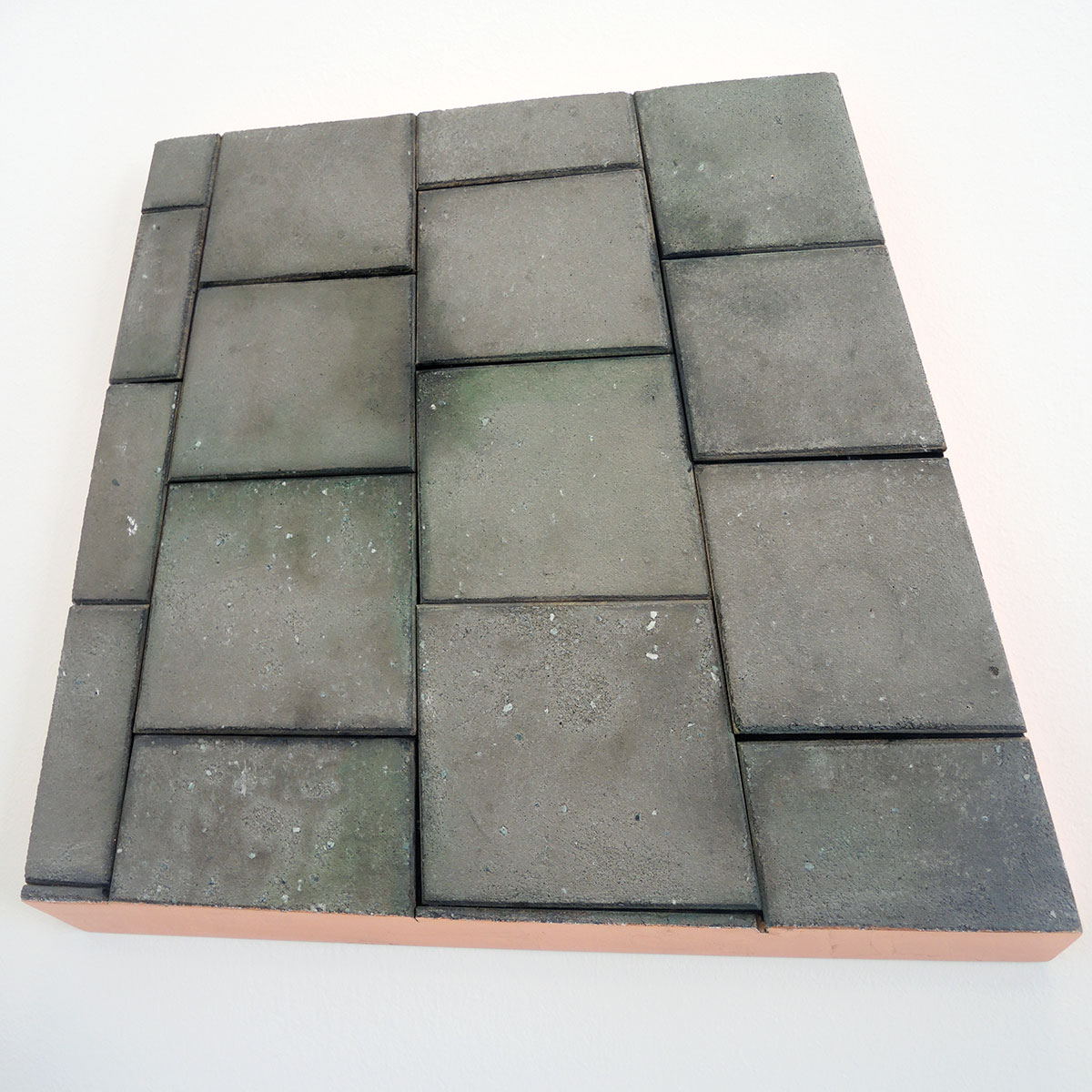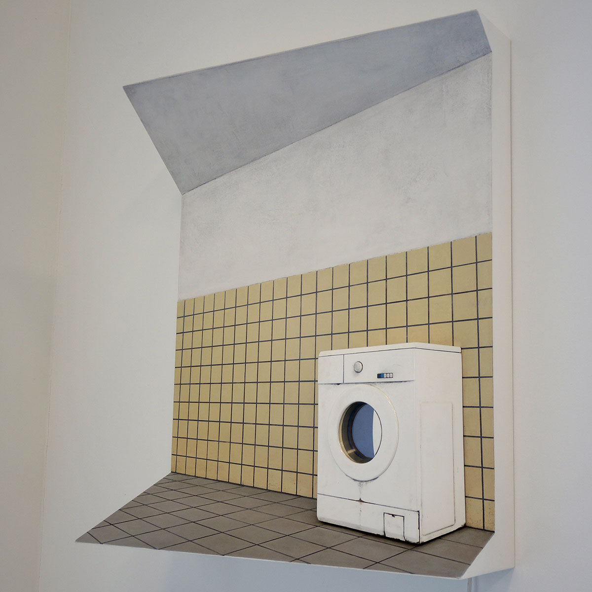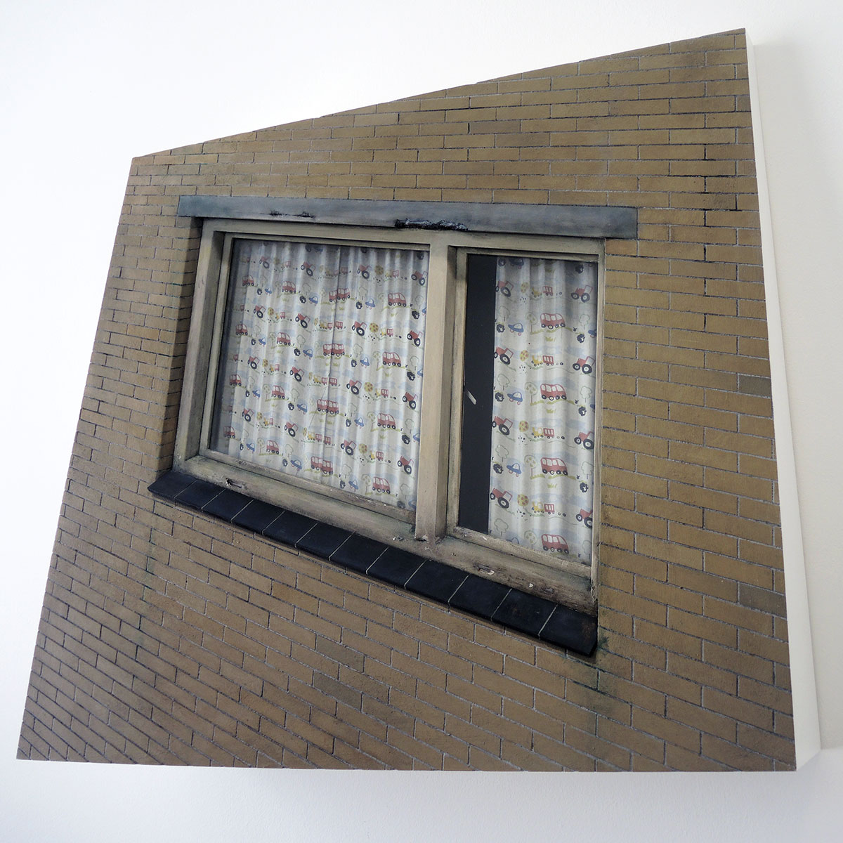 Ook Maurice van Tellingen is geen onruststoker. Zijn tableaus van stoeptegel en bakstenen muur zijn smaller than life en hebben zich, net als het werk van Konijnenburg, neergelegd bij de dagelijkse gang van zaken. De titels bevestigen deze gemoedstoestand. Ook hier is MDF het basismateriaal. En de wasmachine draait rustig door (DWDD) met een ingebouwd filmpje van een wasbeurt. Maar bij ‘Kinderkamer’ ontstaat er toch een zekere spanning. Hoewel het tafereel er uit ziet als een vroege jeugdherinnering, kan ik niet geloven dat er achter deze gordijntjes niets onoorbaars is gebeurd.
