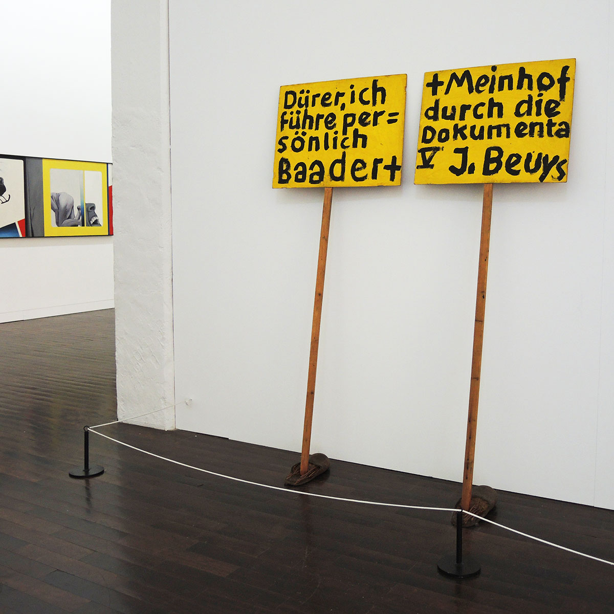 De kwetsbare protestborden die Beuys voor de Documenta maakte, worden hier wel beroerd tentoongesteld. Het witte museumkoord intervenieert met het fragiele beeld van de installatie en maakt de met rozentakjes gevulde pantoffels vrijwel onzichtbaar. Dan liever een extra suppoost erbij. Ook de witte grenslijnen op de vloer, hebben soms een merkwaardig effect op het werk. De sculptuur ‘Warten auf Nürnberg’ van Hans-Peter Alvermann staat in een parkeervak. Of zijn het de markatielijnen voor de plek van de getuigen in de rechtszaal tijdens het Neurenberg-proces?