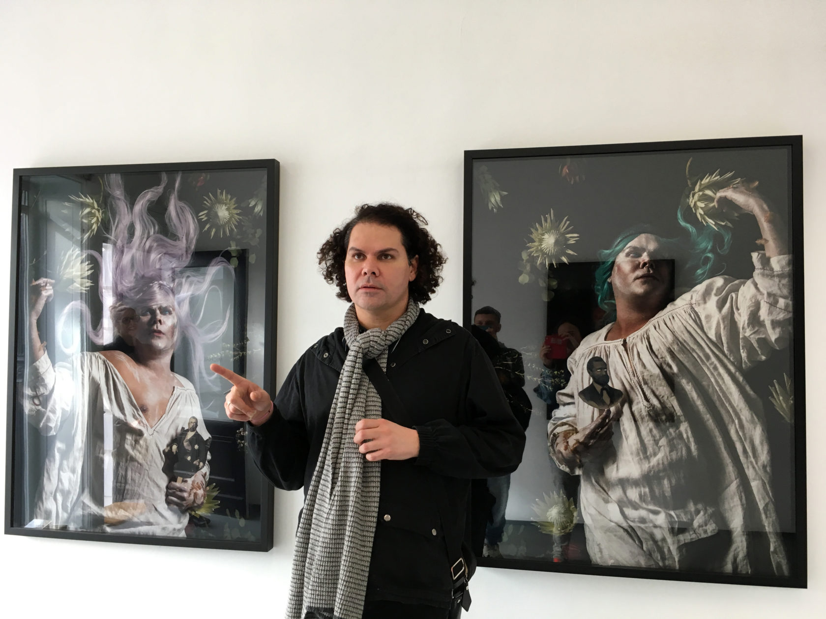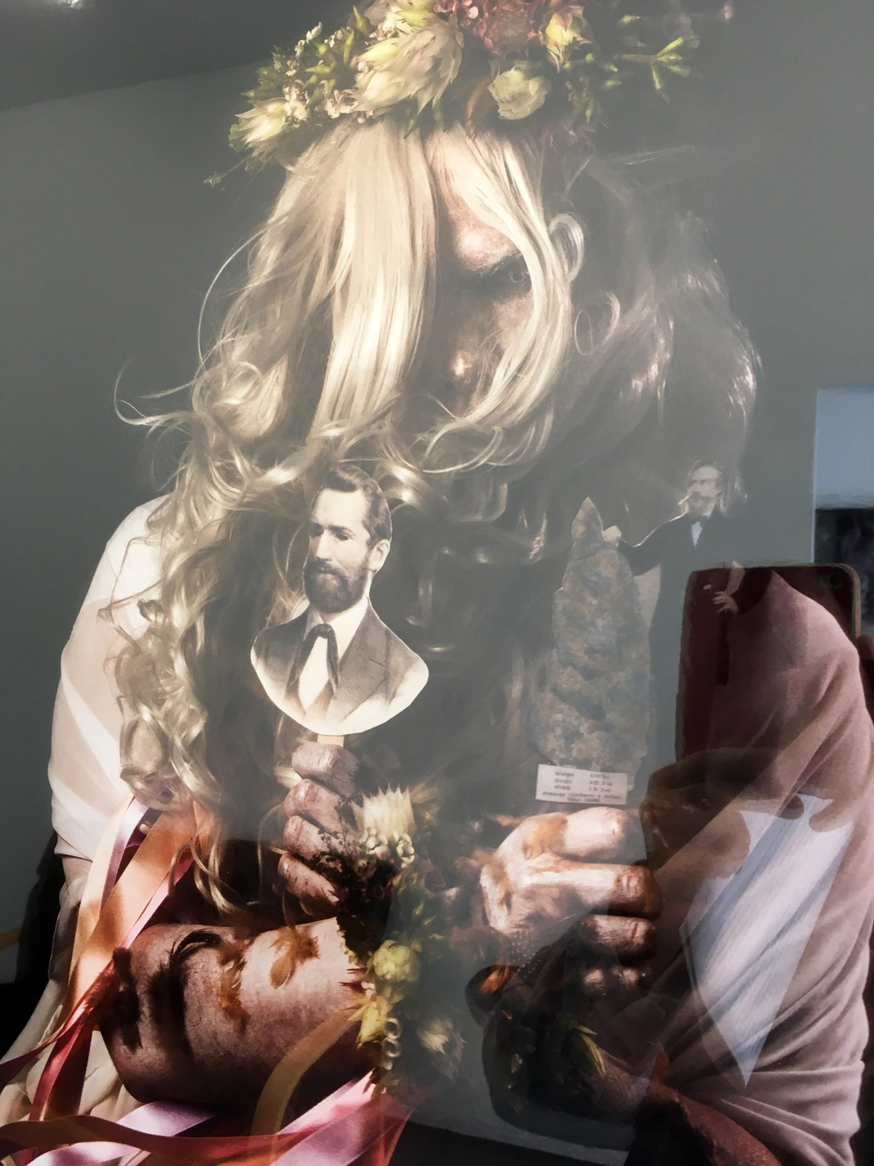 At Galerie Michael Reid we saw Equinox (the equinox is when the sun shines equally on the earth’s northern and southern hemispheres) by Christian Thompson. In his photographs, constructed with the utmost precision, in which he himself merges into compositions and seas of flowers, he becomes nature, or rather Mother Nature, herself. Clasped in his hands on sticks are the cut out silhouettes of German settlers who, in the 19th century, took their booty in Australia. Christian himself was there to explain his work, which was an enrichment I can’t repeat so quickly here, but the exhibition text comes close. A link to it can be found at the bottom.