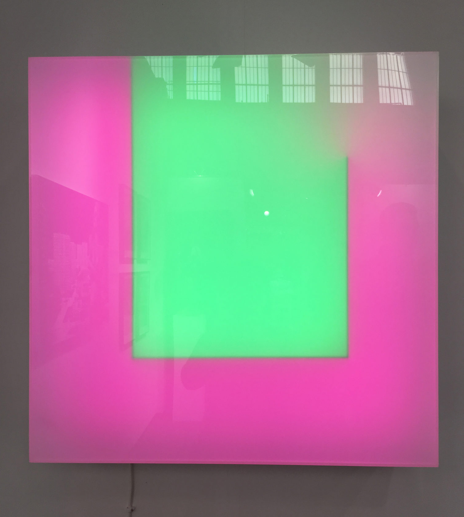 In Galerie Xavierlaboubenne we were personally guided by Anton Stoianov (not entirely coincidentally our host this week; top artist, top host!) through his solo show which this time consists of a series of paintings within the layers of mirrors. Stoianov is an artist who doesn’t easily repeat himself and reinvents himself every time. From the gallery website: “Escaping the repetition of stylistic ideas, Anton Stoianov continues to develop new modes of painting through aesthetic inventions. Anton Stoianov’ s apprenticeship at the Glaser-Innung Berlin for the last two years inspired paintings with ecological miralite revolution mirrors, made of silver instead of lead. The tension between control and hazard of the material produces unexpected layers and seductive-repulsive combinations. The muddied chromatic explosion on cold reflector hints upon the critical reality of planetary doomsday.”