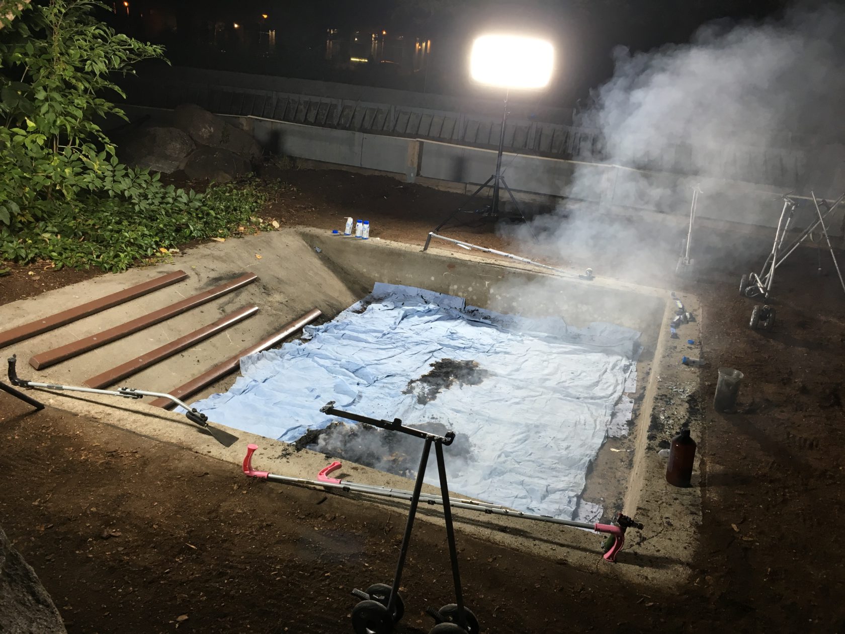“In Mariechen Danz’s “Womb Tomb – Coral Concern” in the outdoor compound, the clay figure “Womb Tomb“ has been laid out. Containing bark mulch from the ground of the enclosure, the sculpture carries the last DNA traces of the bears. Throughout the course of the exhibition, it absorbs information from the environment in multiple stages. As part of Danz’, KAYA’s and Raether’s intricate interactions, visitors are invited to interact with the sculpture together with the artist and contribute to its transformation process by writing their worries on paper scrolls, the so-called worry scrolls and injecting them into the damp clay. After these interactions follows a drying and burning process that incinerates the bark mulch and the worry scrolls within the figure, leaving in its place a coral-like fossilisation. “active ashes (weather map Schnute Maxi)“, a spinnaker fabric with digital prints by Danz, KAYA and Raether is stretched over the “Womb Tomb“ as a protective layer.”