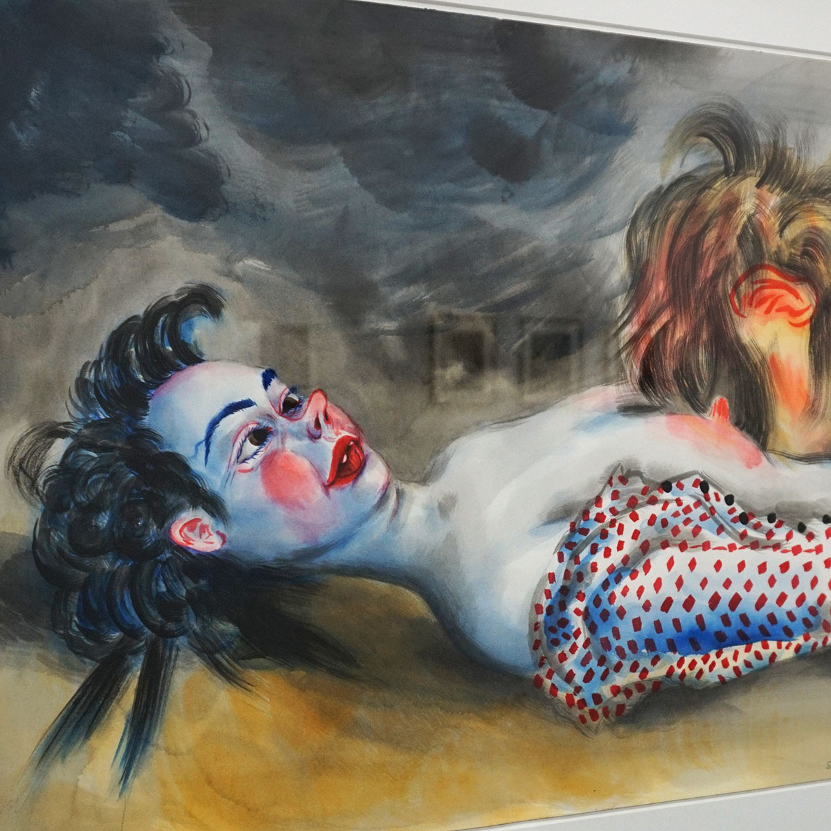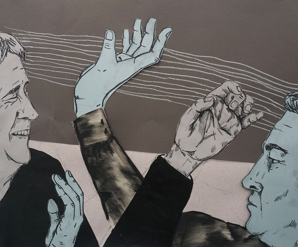 De collage-achtige tekeningen van Susanna Inglada tonen beelden die refereren aan theater en dan met name de interactie tussen de personages. Er is sprake van een duidelijke enscenering van de scenes en de dramatiek is niet ver weg. Hoewel het werk nog diepgang mist en het geheel nog wat geforceerd aandoet, vindt er toch een interessante choreografie plaats tussen de handen die in veel beelden de hoofdrol voor zich opeisen. Met ‘Déjà Vu’ toont Inglada tweemaal dezelfde linosnede, maar met een iets afwijkende presentatie aan de muur bevestigd. Hier toont zich wellicht de hand van de maker.