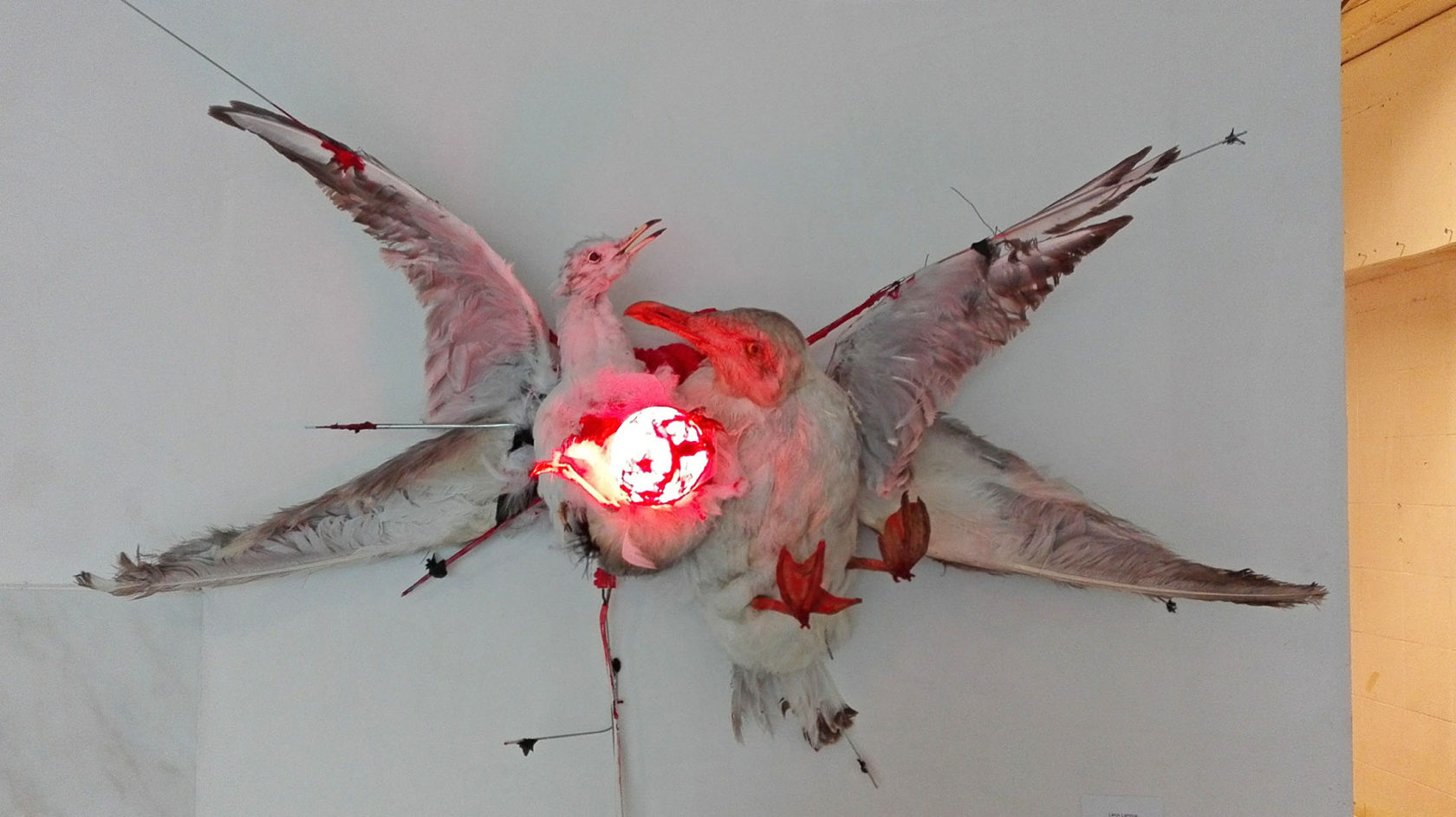 Een klein, maar fraai stuk was de denkbeeldige scene in het café, met Pablo Picasso, een enorm bloederige stierenkop en een afgesneden detail van een originele Picasso. Bloederig maar fascinerend tegelijk waren de verbrijzelde vingers aan een hand, waarnaast een object met een opgezette vis van Jef Andrea. Met net zoveel gemak en interesse schildert Sam Andrea een vuilniszak op straat of een detail van zijn been. Tezamen met de soms absurde installaties, deels bestaande uit karkassen van beesten, door zijn oom Jef, vormde deze expo in de Vlieg een spannend geheel.