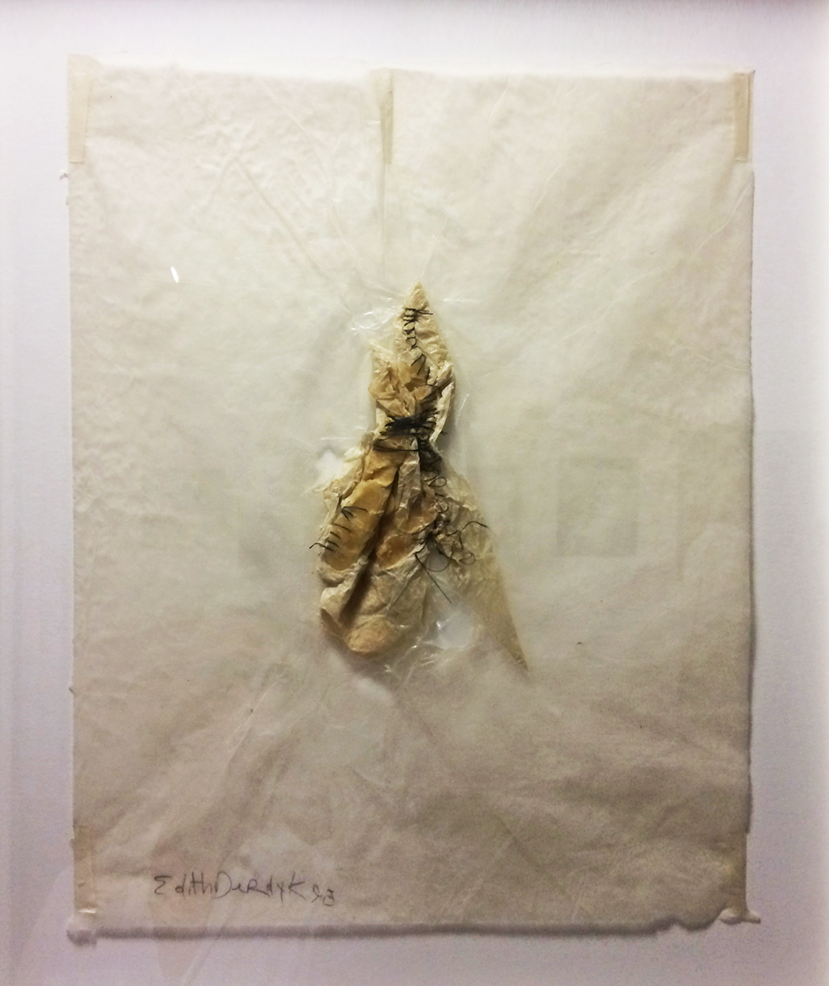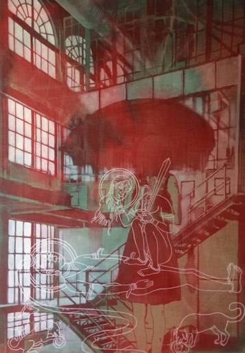Het werk van Atousa Bandeh viel me op. Het was heel fijn om naar te kijken, omdat het beeldend zo sterk was en tegelijk om het verhaal dat het oproept. Grote vellen papier met daarop een kleurenlandschap, opgebouwd als een vertelling. Een kind op een fietsje rechts, een groepje oudere mensen links. Ze lijken uit ander papier geknipt te zijn en geplakt op het grote vel, ze zijn nauwelijks ingekleurd. Ze steken sterk af tegen het heldere rood en blauw van het ‘landschap’, en geven iets mysterieus aan het werk. Wie zijn deze mensen, wat betekenen ze voor elkaar? Waarom staat het kindje apart van de rest, wat is dat landschap vol met kleine afbeeldingen van gebouwen en kroonluchters?