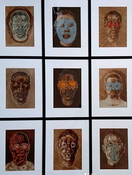 Nanon Morsink toont een serie portretten. In een raster van vier bij vier hangen donker gekleurde portretten waarop met dik draad een patroon is geborduurd. De ene keer zijn de ogen en mond geaccentueerd door de borduursteken, bij een andere vormen ze een versiering over het gezicht, en bij weer een andere is er bijna niks meer van het geschilderde portret te zien; alles is overwoekerd door geborduurde bloemen.