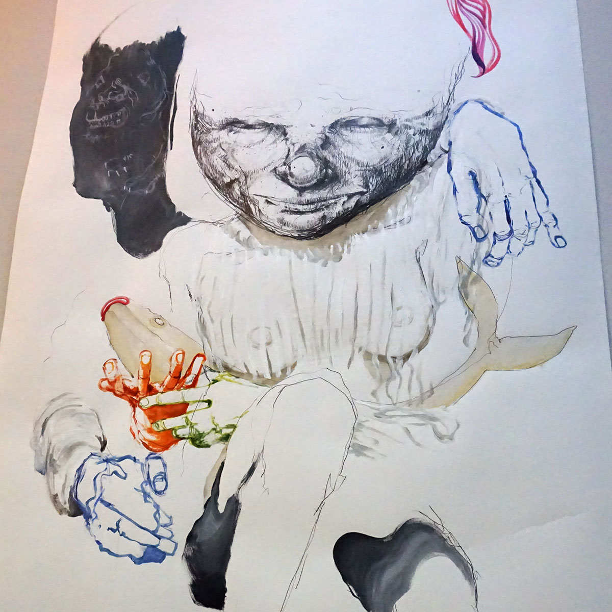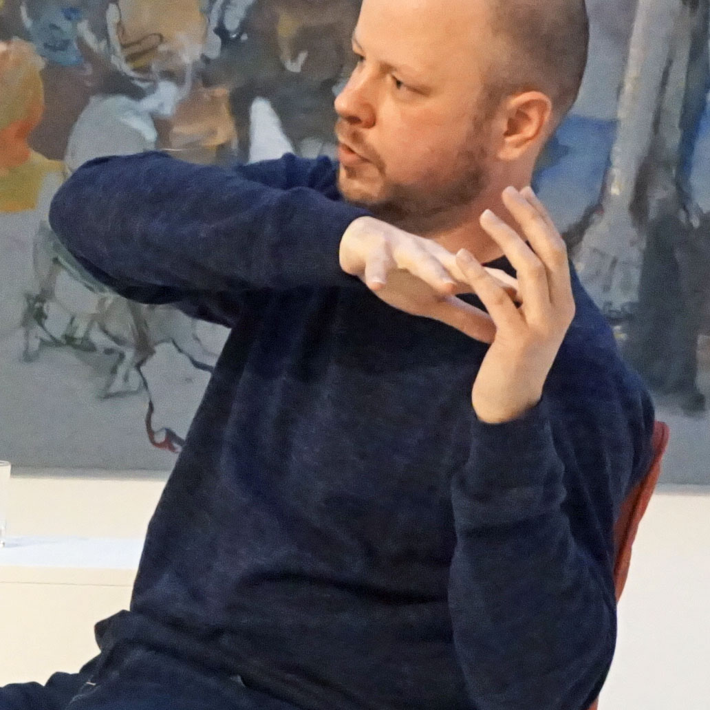 Al snel gaat het gesprek over de jaren ’80 toen Charlotte Mutsaers begon met lesgeven op de Rietveld Academie. Ze was er getuige van hoe de beoordeling van kunst in korte tijd drastisch veranderde. Een kunstenaar moest opeens een goed dichtgetimmerd verhaal hebben en precies kunnen vertellen waar hij of zij mee bezig was. Voor het eerst hoorde Mutsaers dat kunstenaars ook actief moesten ‘netwerken’. Het woord was nieuw voor haar en kwam haar buitengewoon smerig voor. Schoonheid werd een verdacht woord dat ten alle tijden moest worden vermeden. ‘Mooi’ diende te worden vervangen door ‘interessant’ of ‘bijzonder’. Maar mooi is volgens Mutsaers een begrip dat niets anders uitdrukt dan dat je ergens waardering voor kunt opbrengen. En de schilderijen van Dave de Leeuw zijn mooi. Het coloriet bevalt haar evenals de organische totstandkoming van zijn composities en het open karakter van de afgebeelde figuren. En dan die verbijsterend mooie handen! zowel in de schilderijen als in de tekeningen. Hoe komt het dat je dat in de vingers hebt?