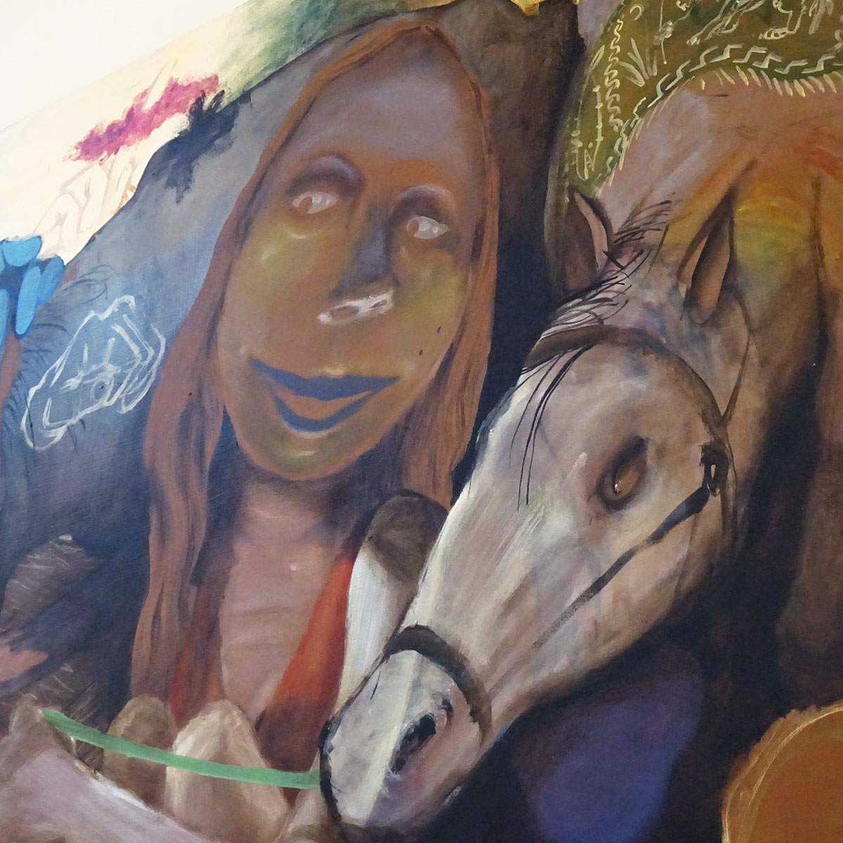 De gesprekspartners kunnen het goed met elkaar vinden. Er vallen geen ongemakkelijke stiltes, maar af en toe zitten ze wel op een hele andere golflengte. Dave verbindt zijn autobiografische schilderijen graag aan de wereld als geheel, terwijl Charlotte de dingen graag terugbrengt naar concrete gebeurtenissen en individuele ervaringen. Terwijl Dave het heeft over de kosmos, atomen en de supernova waaruit onze wereld is ontstaan, rijgt Charlotte de ene anekdote aan de andere waarin ze zich vooral richt op het specifieke en persoonlijke. De schilder en de schrijfster splitsen zich hier. Dave wijdt uit over zijn fascinatie voor de wetenschap en Charlotte vertelt over een droom waarin een paard probeerde om op haar schoot te zitten. Een onmogelijkheid in de realiteit natuurlijk, maar binnen de schilderkunst is het beeld prima te verwezenlijken. Mijn hoofd draait weer naar rechts. Wacht even, wat gebeurt hier? Het paardenhoofd op het schilderij, waarvoor ik eerder weinig aandacht had, toont inderdaad een brutale interesse in de schoot van Charlotte. En volgens mij heeft Charlotte het ook gezien.