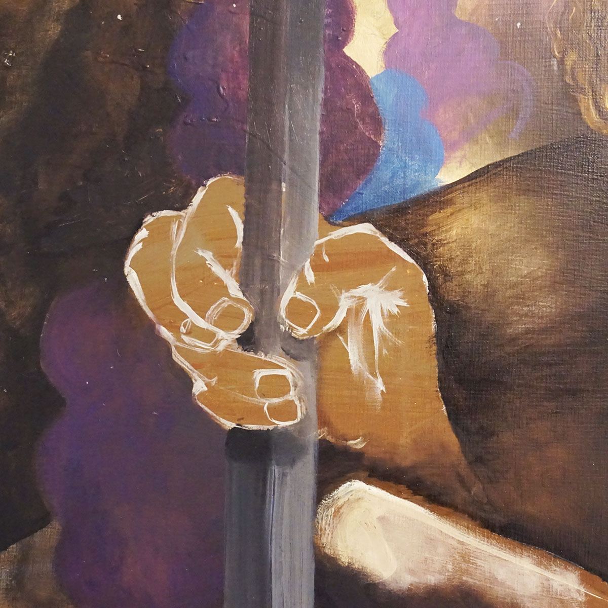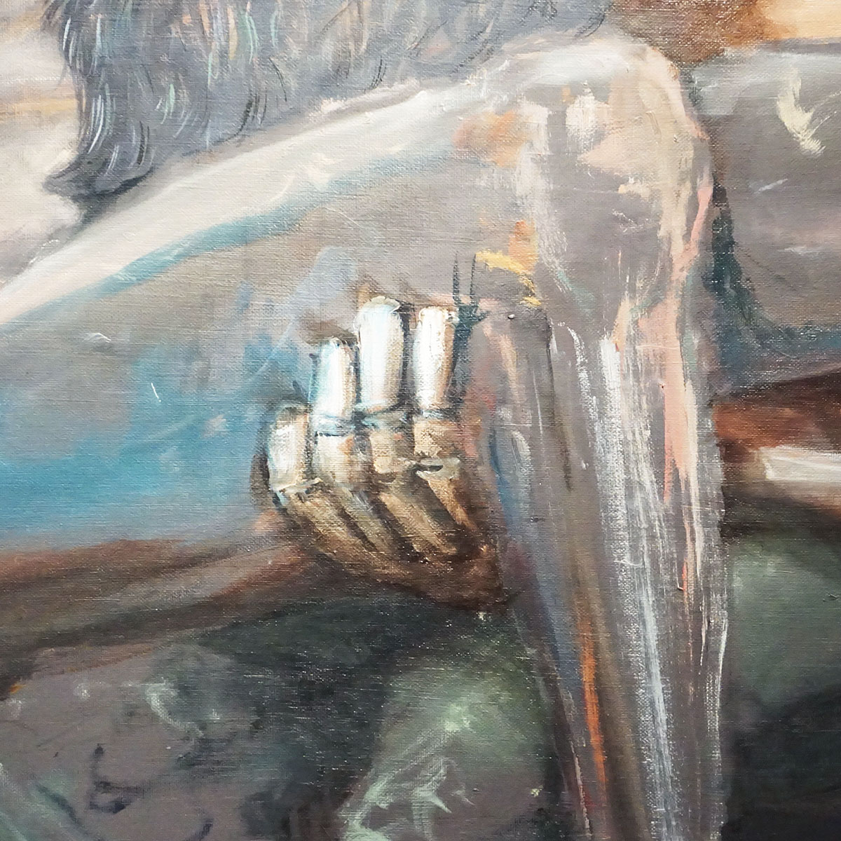Wanneer Dave vertelt over de rol van handen in zijn werk, maken zijn armen steeds grotere bewegingen. Ook hier speelt het onderbewuste blijkbaar een rol. Charlotte merkt op dat het frappant is dat je tijdens het schilderen nog gewoon kunt bedenken wat je vanavond zult gaan eten. Het schilderen gaat aan het denken voorbij. Tijdens het schrijven gaat dat niet. En even later moet ze denken aan hoe haar hand in een overvolle metro in Parijs een paal omklemde, samen met 12 andere handen. En hoe een van die andere handen het hare begon te strelen. De hand kwam uit een mouw maar het was haar niet meteen duidelijk wie of wat er aan die hand vastzat. Een wonderlijke ervaring. Opnieuw een thema voor een nieuw schilderij. Als Charlotte een schilderij mee naar huis mocht nemen dan zou dat het schilderij rechts van mij zijn. Het is een groot schilderij waarvoor ze helaas geen ruimte heeft, maar het is trefzeker gemaakt en enigszins duister. Ondertussen zie ik het nog steeds als een hommage aan Charlotte zelf.