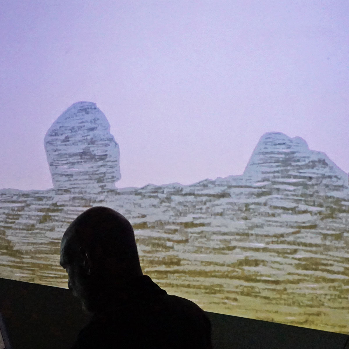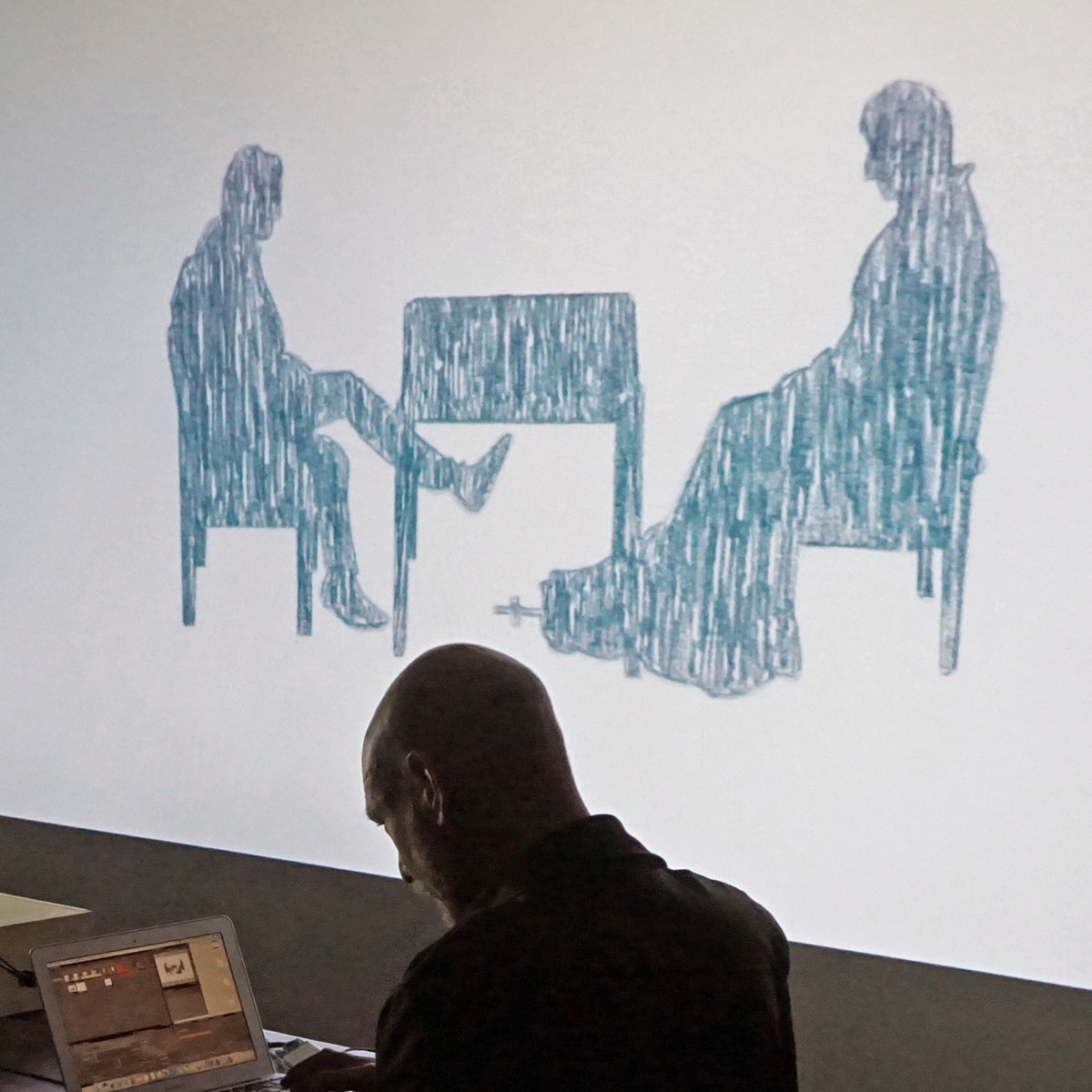 In de benedenruimte vindt de eerste in tijd begrensde live performance van de avond plaats. Het duo Lucas Hoeben (Karla Hoeben en Martijn Lucas Smit) brengen een landschap van iconische kunstwerken in beeld en hebben componist Joost Nelissen gevraagd om daar een soundscape aan toe te voegen. De kunstenaars zitten tegenover elkaar aan een lange tafel en bedienen de audiovisuele vertelling No New Museums and Other Stories dat achter hen wordt geprojecteerd. Wat ze precies doen weten we niet, maar we zien gearceerd getekende animatiebeelden voorbijkomen waarin beelden uit de recente kunstgeschiedenis zijn verwerkt.