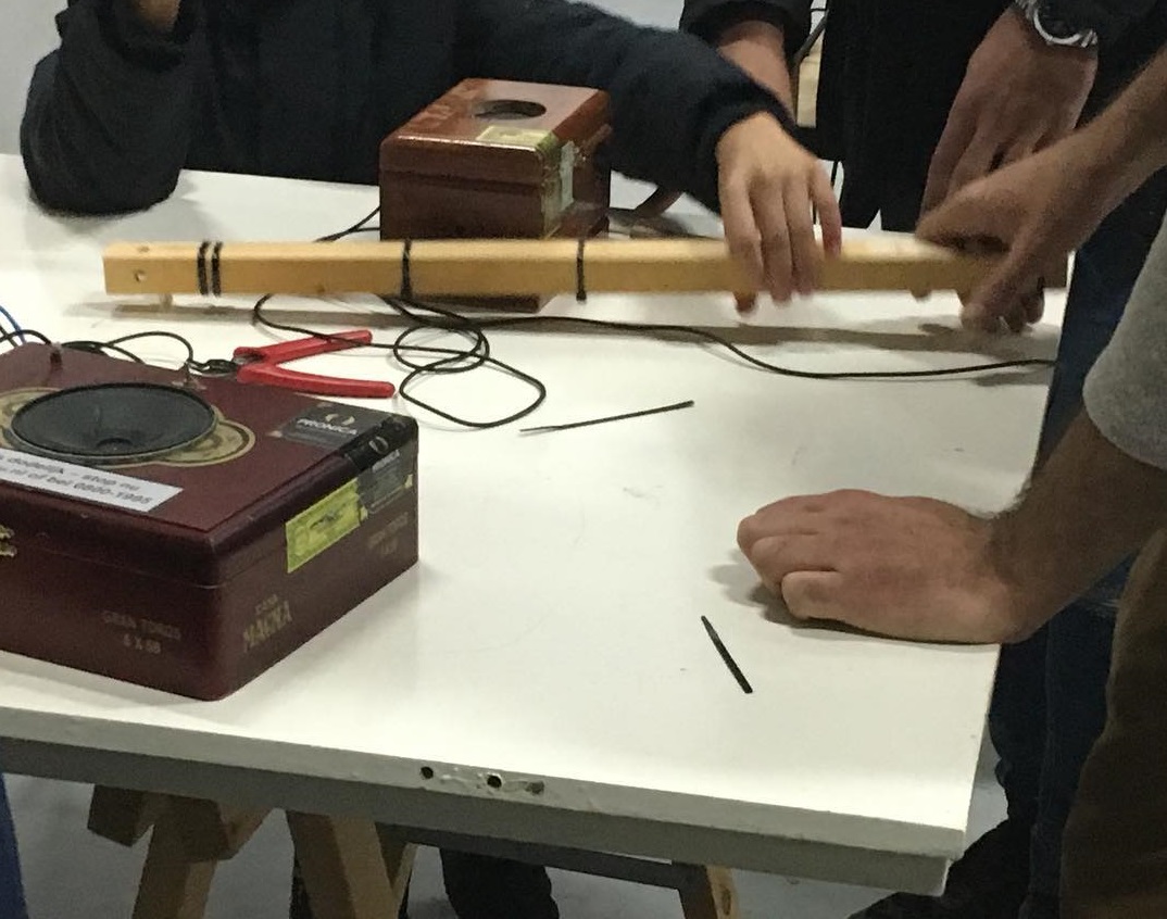 It is a very short workshop of three sessions. For the first session we are going to the sound room in the Museon. It is a good place to talk about things, so they will hear about some topics such as waves, frequency, loudness and timbre. The next session will be here at the iii workspace, and will be more hands on. I will give the kids these little amplifier boxes that I am building out of cigar boxes. They will also be provided with a piezzo mic and a mono chord guitar-like instrument. Then I ask them to add frets to the guitar, based on what they want to play with it. It is an open discussion class, so everybody can play and ask. The last session will be at their school, where everybody presents what they made.