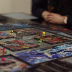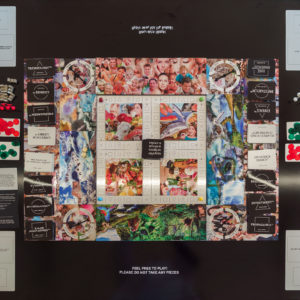During the preparation phase, we revamped the rules and transformed the game into a multimedia installation. We printed the board graphics into a metal sheet, made a short video-trailer and four flags for the four characters. Together the pieces tended to evoke an intimate, but a sinister atmosphere where humour and existential anxiety can exist hand in hand.
