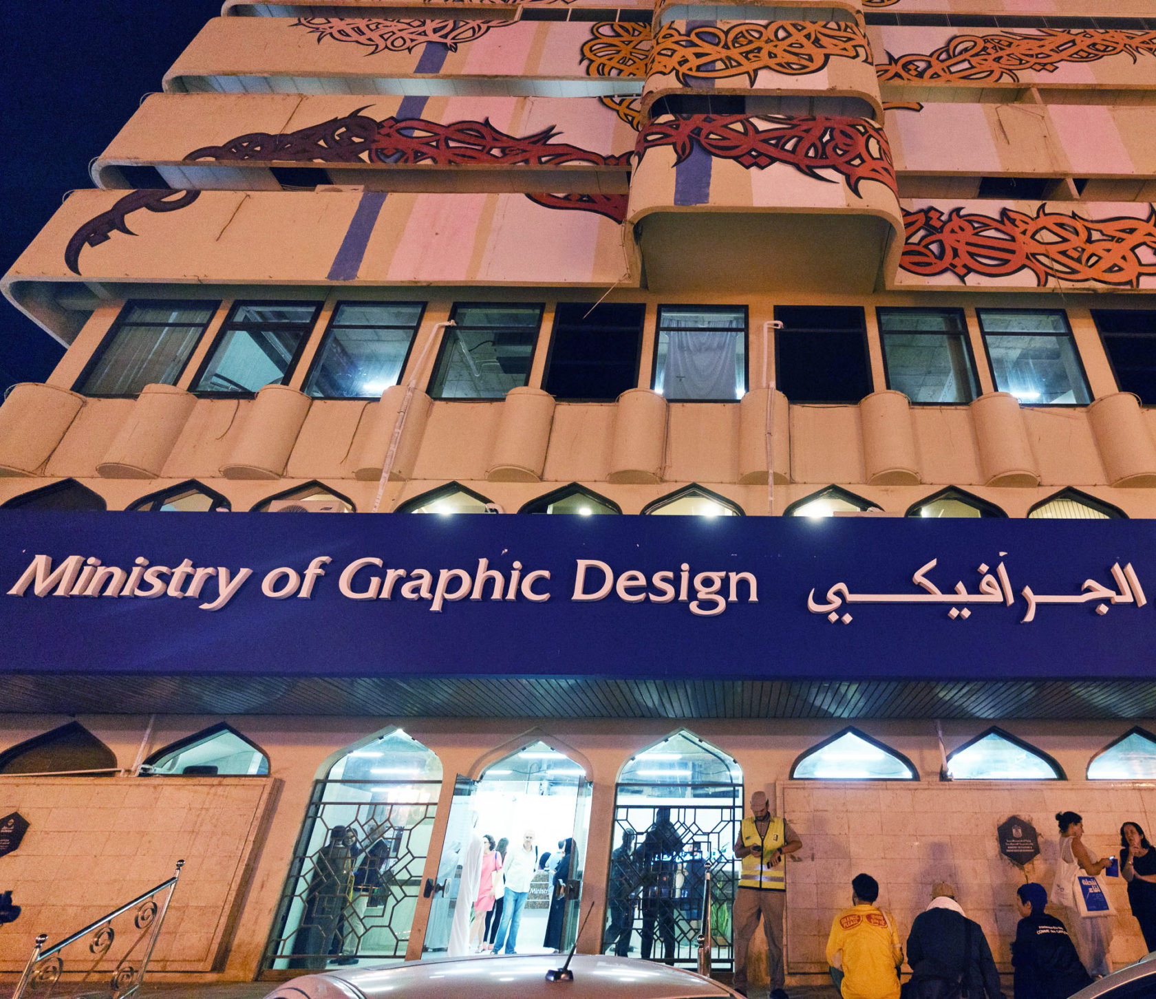 It was hard to adapt to the extreme climatic shifts between the air-conditioned inside and the torrid outside resulting many small, rapid series of goose bumps. Hum of international teams of installers, technicians, experts, volunteers, and fellow participants were lurking around the five departments of the Ministry of Graphic Design: Graphic Optimism, Non-Binaries, Flying Saucers, Dematerializing Language, Mapping Margins, and Office of the Archive established by the artistic directors Na Kim, Emily Smith, and Prem Krishnamurthy, together with the Biennial director, Salem Al-Qassimi, the founder and director of Fikra Design Studio. The overall focus of the biennial was “Spanning urgent narratives, participatory systems, research-based approaches, conceptual reflections, and historical re-framings. Also, the Ministry’s broad scope suggests the unique value of the graphic designer’s interdisciplinary perspective.”