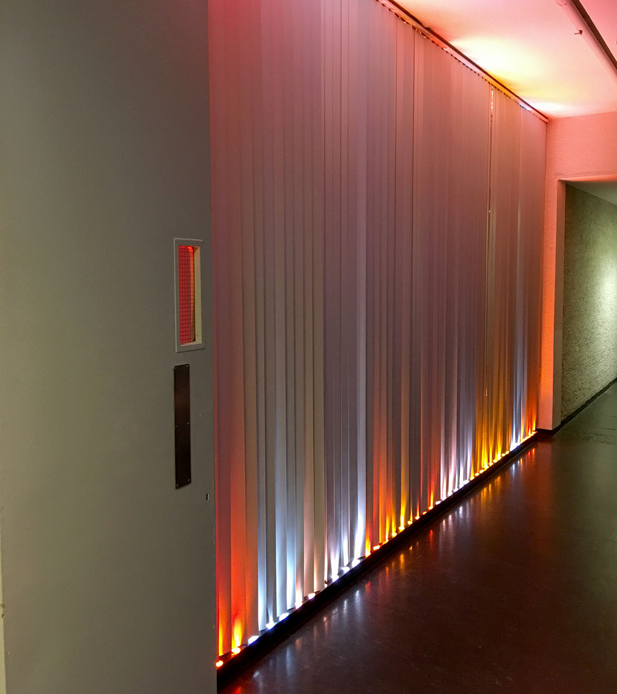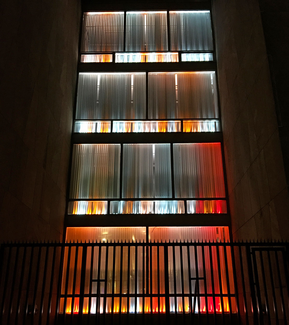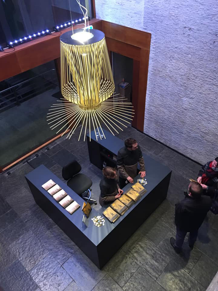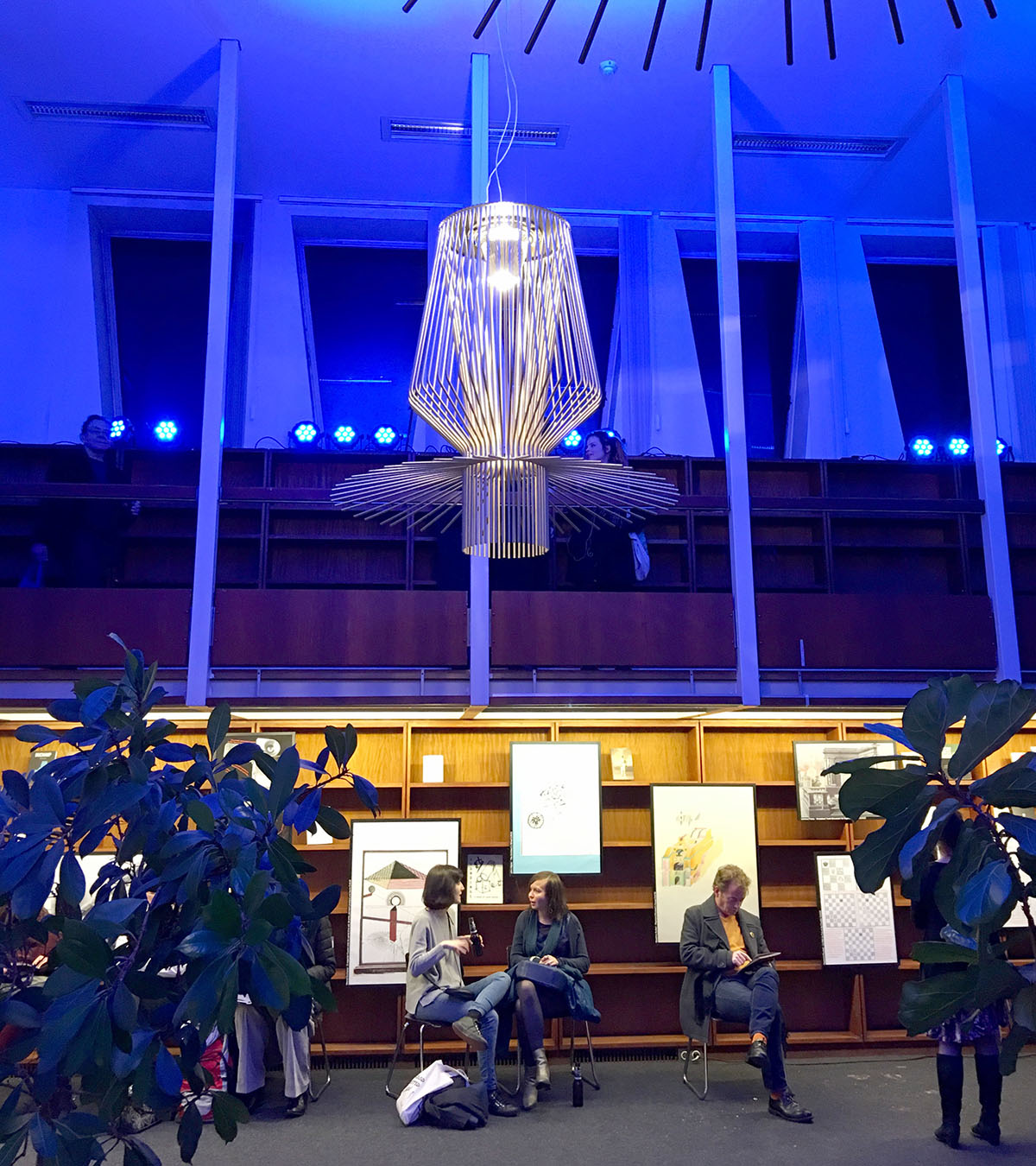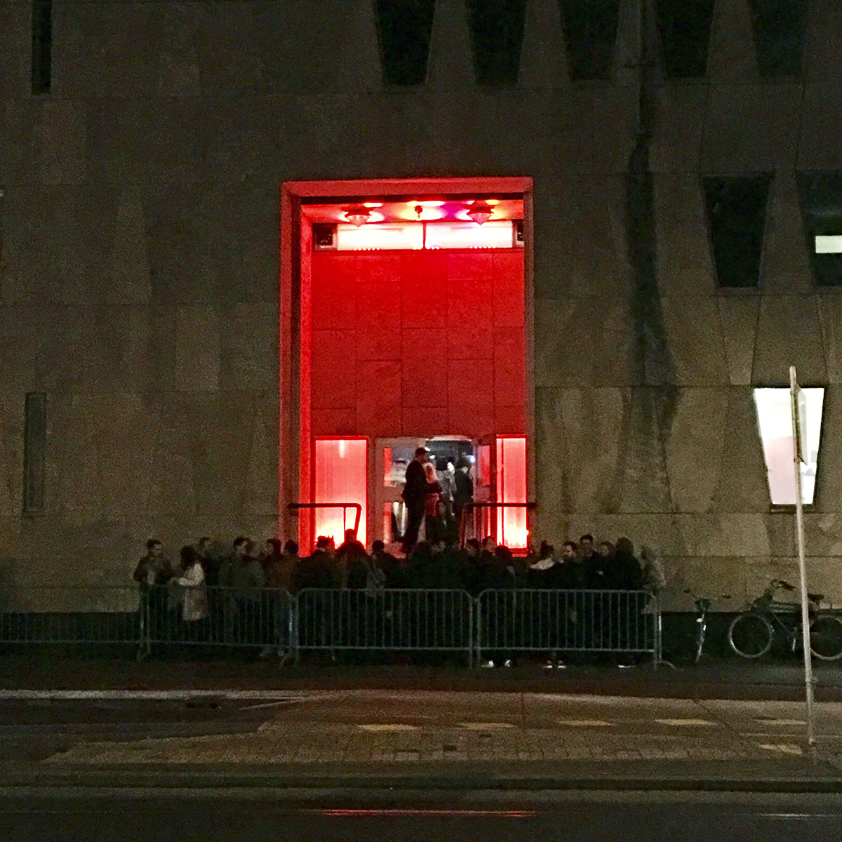 De ambassade van Breuer is een spannend gebouw dat bestaat uit vele kleine kamertjes en gangen en waar de Koude Oorlog nog rondwaart. Niet lang na de val van de muur bezocht ik in Berlijn ‘Haus 1’, het hoofdgebouw van de Stasi, waar een tentoonstelling over de (afluister)praktijken van de Staatssicherheitsdienst te zien was. Het gevoel van het gedateerde interieur (Haus 1 is uit 1960), het stemmige grijs en het onoverzichtelijke doolhof van kantoortjes komt weer helemaal terug wanneer ik door de voormalige Amerikaanse ambassade in Den Haag loop. Ook de aanwezigheid van de vele toezichthouders in Onze Ambassade versterkt het idee dat we in de gaten worden gehouden en dat we ons geen misstap kunnen veroorloven. Maar tegelijkertijd is er ook een feestelijke stemming die me doet terugdenken aan het Stedelijk Museum van Willem Sandberg. In het auditorium krijg ik het gevoel dat Lucebert ieder moment als Keizer der Vijftigers binnen kan komen in een toepasselijk koninklijk gewaad. Maar met performer/verteller Guy Tavares op de podiumzetel hebben we een goede vervanger.