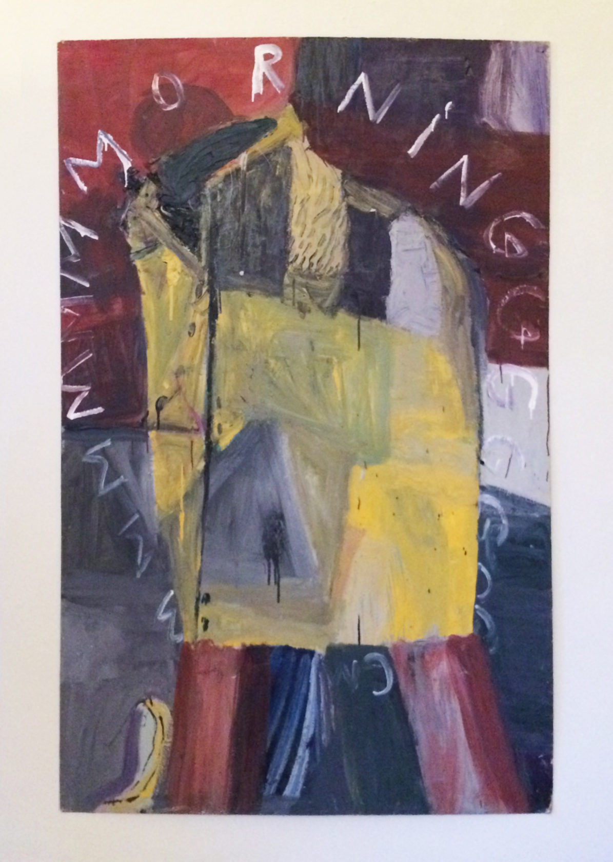 Ik hinkte heen en weer tussen het aan de ene kant willen weten waarom hij had geschilderd wat hij had geschilderd en aan de andere kant laten bestaan van het schilderachtige. De afbeeldingen gaven stof tot een vertelling, tot iets dat er misschien wel, misschien niet achter verscholen lag. Maar de opdeling van het schilderij in een aantal kleine doeken alleen maar omdat zijn atelier zo klein is dat er geen groot doek in past, gaf juist losheid aan: niet moeilijk doen en gewoon laten zijn wat het is.