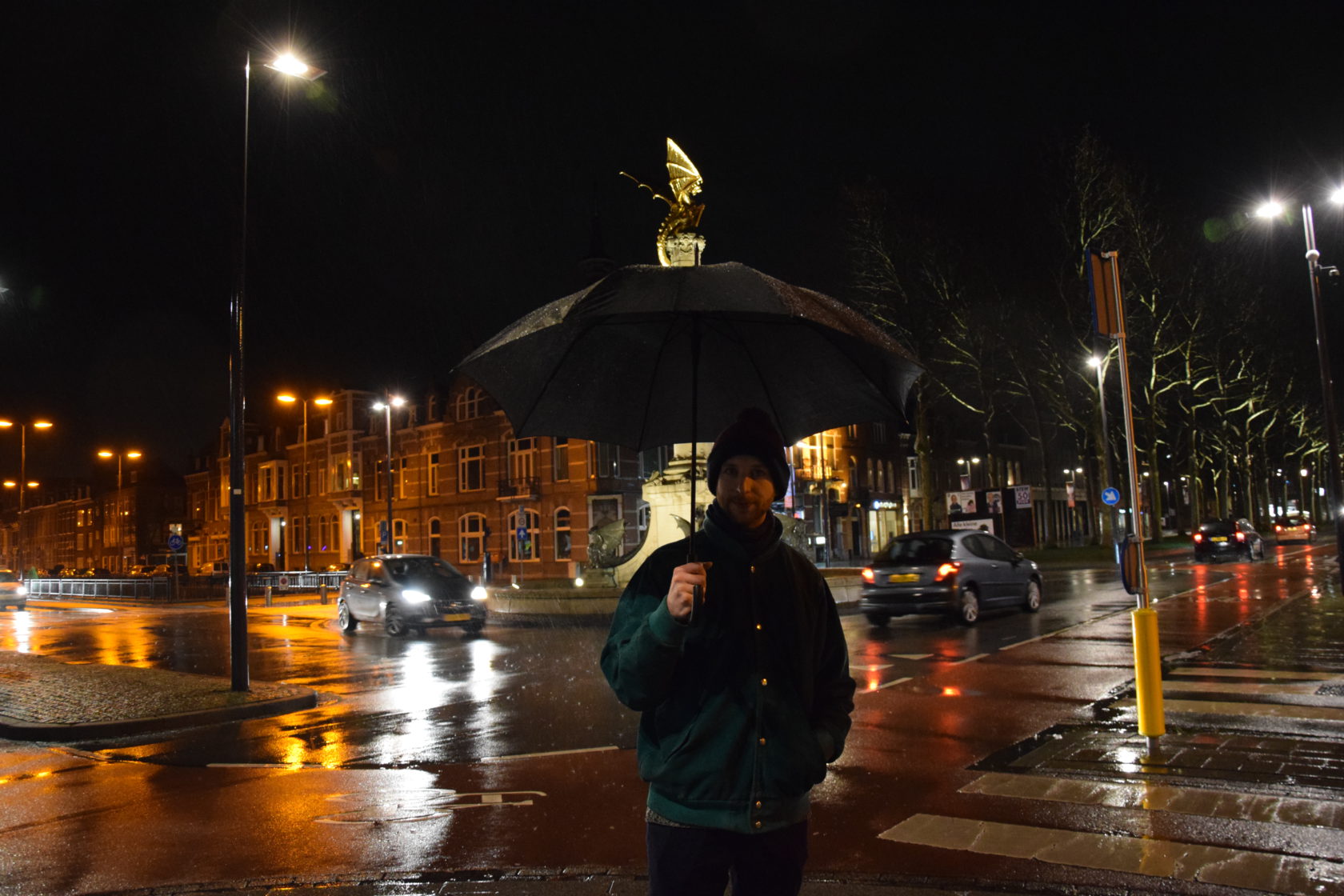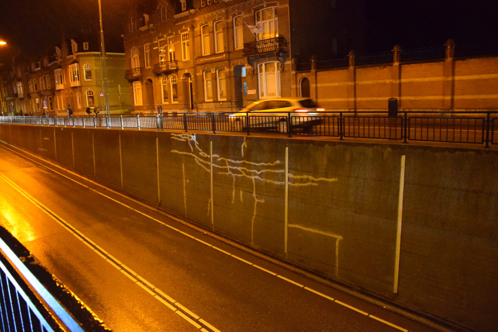 Onze wandeling loopt ten einde, de paraplu heeft niet kunnen weerhouden dat ik nat geregend ben. We lopen door het station, roltrap naar beneden en ik neem nog even een foto van Remy bij de draak. Hij neemt me mee naar een gerestaureerde muur -onder een brug- vlakbij het beeld. Er waren scheuren in ontstaan die dichtgemaakt zijn waardoor de tekening van een draak zichtbaar wordt die de muur zelf heeft veroorzaakt. Voor zijn studie aan de academie begon Remy als graffiti-kunstenaar, en dit is toch wel een sterk staaltje van graffiti. En van een transformatie!