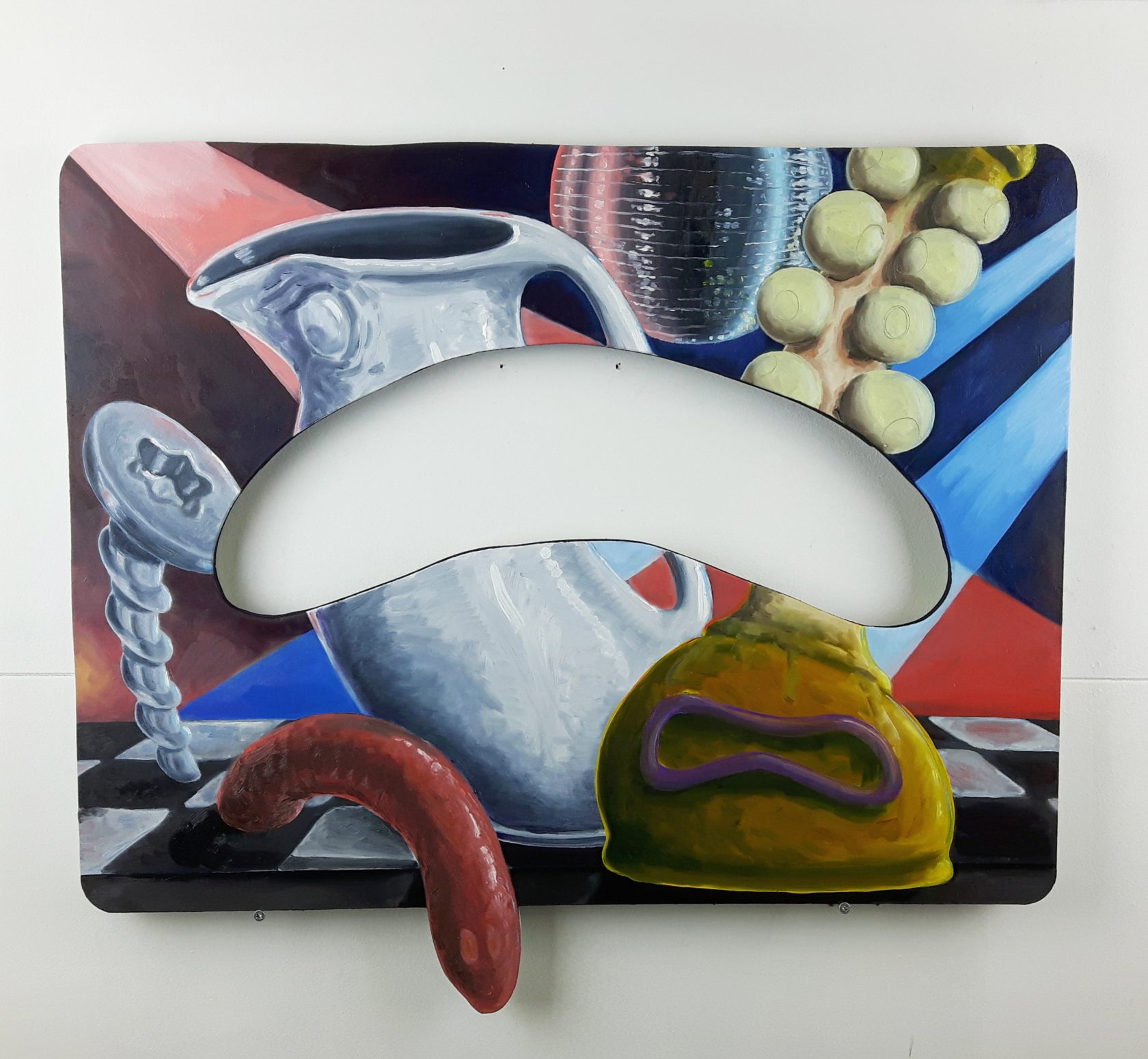 In het gat dat in het paneel is gezaagd, rust een kauwgommetje. Door middel van dat gat onderzoekt Remy de spanning tussen het platte vlak als illusie naar een andere wereld dat doorbroken wordt en het schilderij daarmee tot object maakt. De kauwgom ziet hij als een sculptuur; een restvorm van een eerste fase van vertering. De kauwgom is een banaal ding dat betekenis krijgt in een nieuwe context. Hij kijkt graag naar banale dingen; ze hebben een essentiële waarde dat iets zegt over het leven. Het gaat over transformatie; het anders kijken naar banale onderwerpen gekoppeld aan grote thema’s waar nieuw leven en dood samen komen.