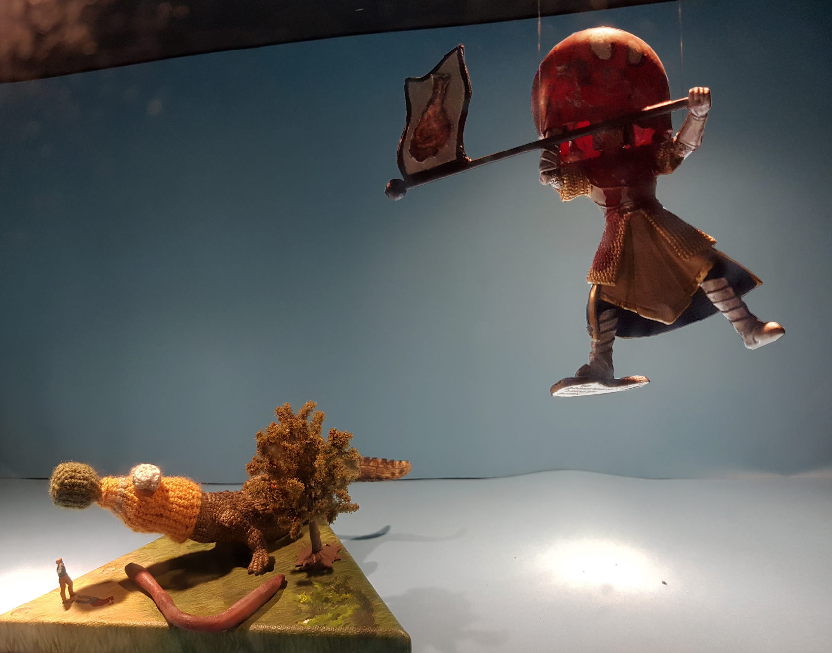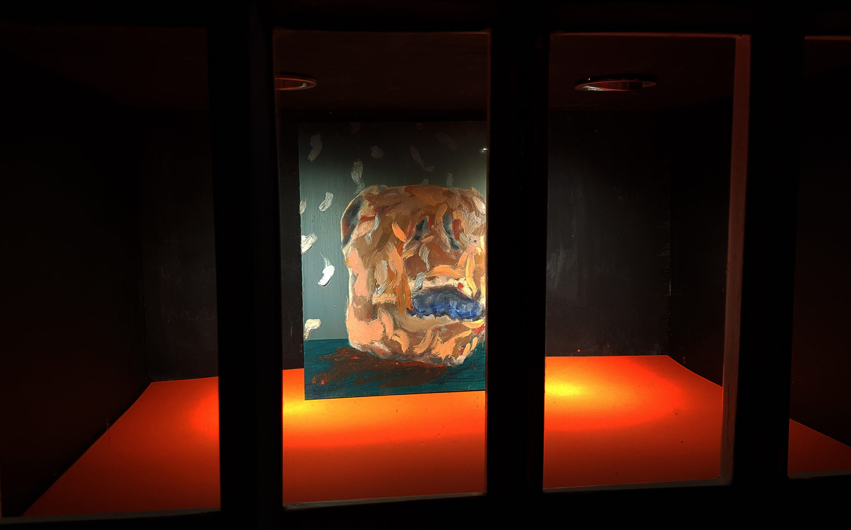 In Nova Zembla’s Microgalerie is van Remy een schilderij te zien met de titel ‘Goat’. Het werk gaat een relatie aan met het ruimtelijke werk van Marthe Zink (1990) dat er naast te zien is. Marthe’s absurdistische werk speelt zich af in een blauwe wereld waar mensen een relatie aangaan met dingen die uit hun context zijn gehaald. Het rode vlak waar Remy’s schilderij ‘Goat’ op rust verspreid zich in het donker van de avond door het licht dat erop schijnt. Remy vertelt over zijn fascinatie die hij deelt met Marthe voor het absurde, drama en humor.