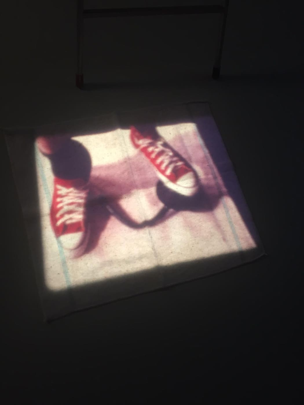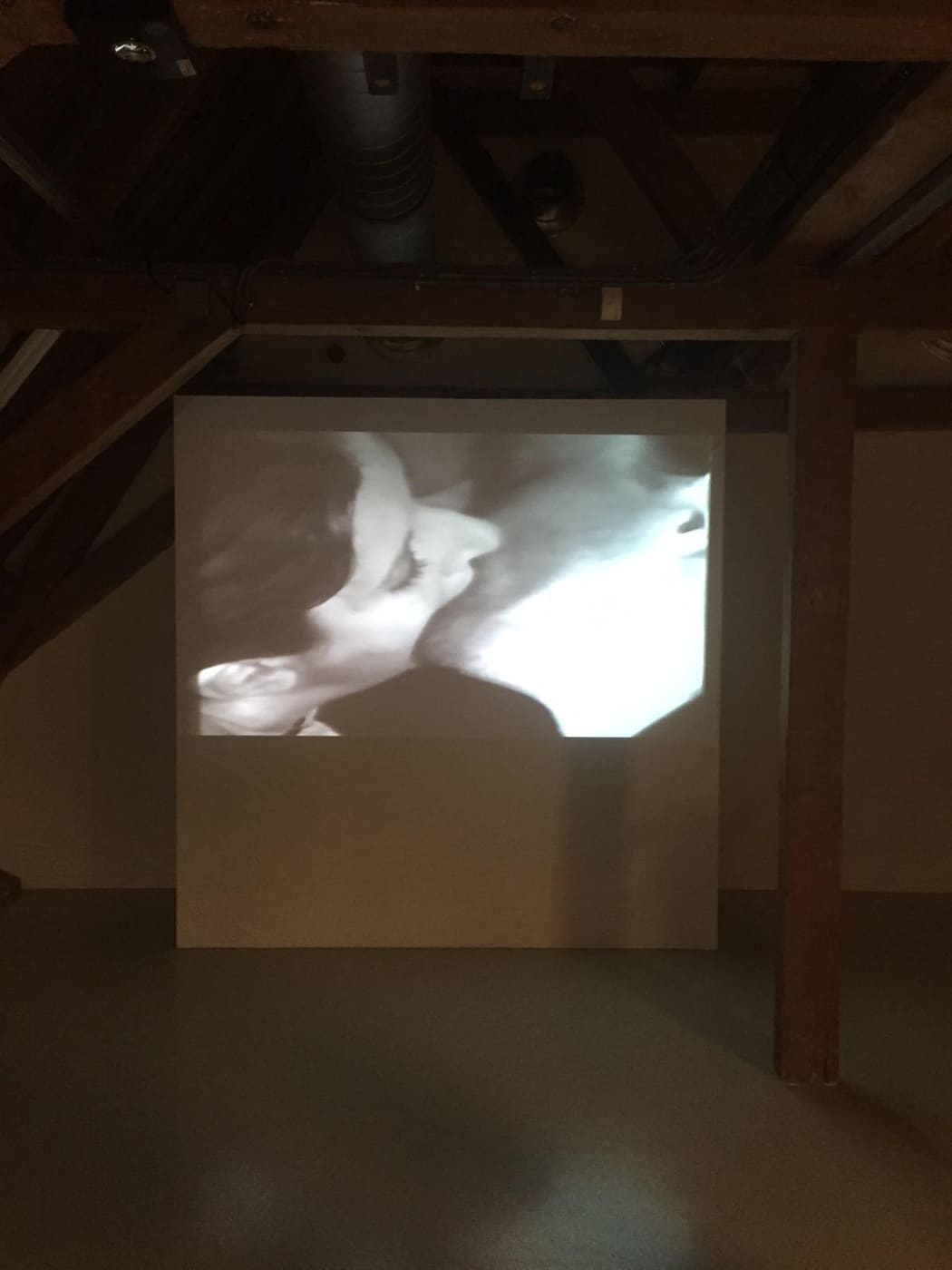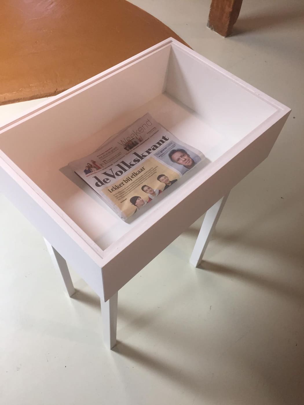 Primeur op de houten zolder is Schippers’ Pindakaasvloer (1962, eerste versie). Het is al weer acht jaar geleden dat deze vloer voor het laatst te zien was in een tentoonstelling. Behalve de rechthoek in Museum Boijmans van Beuningen heeft de vloer verschillende andere vormen aangenomen, zo ook hier. Op de zolder van het museum is de vloer rond, één hap ontbreekt. De vloer toont zich niet enkel aan ons oog, maar laat vooral de geur het werk doen. “Het stijgt naar mijn hoofd”, mompelt mijn vriend, die er doorgaans dol op is. Liters pindakaas vullen de ruimte. In de ontbrekende hap leunt de steunpaal van het museumplafond en is een vitrinekastje met daarin de krant van het betreffende weekend [9 en 10 februari 2019] geplaatst. Wat doet deze krant hier? Als pindakaas kunst is, en de lucht, is een krant dat dan niet óók? Het leven, een kunst. Op SCHIE TV spreekt Schippers de volgende woorden: