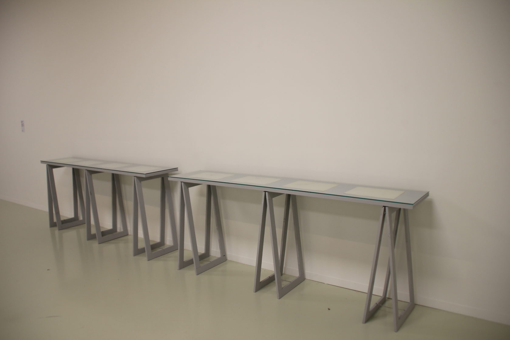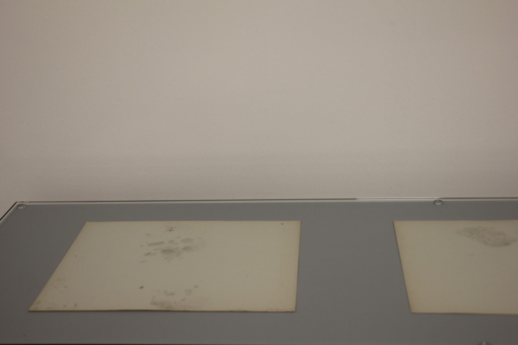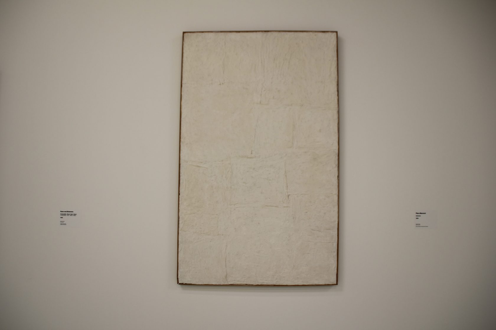 Manzoni’s aanvankelijke wit wordt in Schiedam in een aparte museumzaal met lichte gordijnen getoond, wat eventuele ruis van buitenaf blokkeert. De ruimte is gevuld met witexperimenten (in verf, glaswol, geverfde stenen, porselein en andere materialen/objecten die het werk van gelaagdheden en patronen voorzien) die zowel ingelijst als naakt tegen de muur zijn gehangen. Deze afgesloten museumcocon maakt de (schilder)werken van Manzoni, maar ook die van Henk Peeters en Jan Henderikse, zacht en ingetogen wanneer je het vergelijkt met Yves Klein’s blauw, even verderop. Is het wit wat we zien het wit zoals door Manzoni bekeken, of doet dit er eigenlijk niet toe? De blauwe pen in mijn hand valt op de grond en voelt onoverkomelijk als vergif waar ik vanaf moet. Bang voor een onbedoelde streep, die Manzoni wellicht óók had kunnen waarderen.