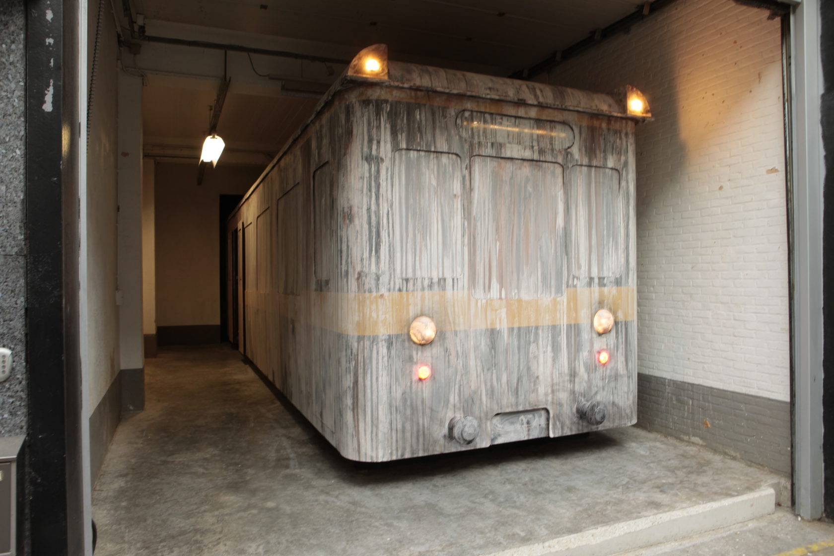 De installatie verhoudt zich nadrukkelijk tot de plaats waar ze zich bevindt en de tijdelijke aard. Cafmeyer heeft alles tot in de kleinste details in scène gezet. De illusie is zo geloofwaardig dat we nauwelijks zien dat de schaal niet klopt. Er staan een auto en een brommer geparkeerd. “De auto oogt groot in deze ruimte”, beaamt Cafmeyer. “Maar een normale auto weegt 1000 kilo terwijl deze maar 750 kilo weegt. Een grotere auto kregen we hier niet naar boven. Daarnaast zou het opvallen dat deze ruimte in feite te klein is.”